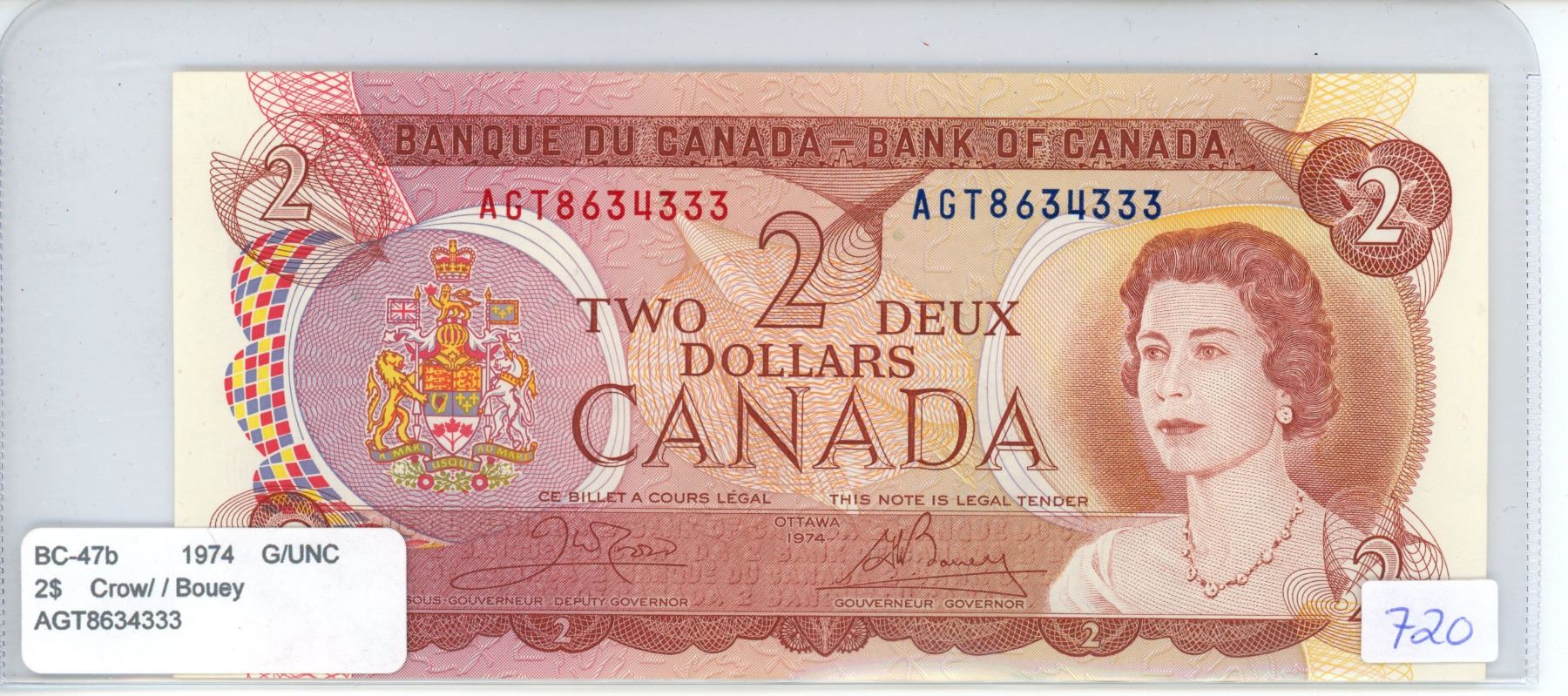 1974 Canada $2 bill, Crow/Bouey, # AGT 8634333
