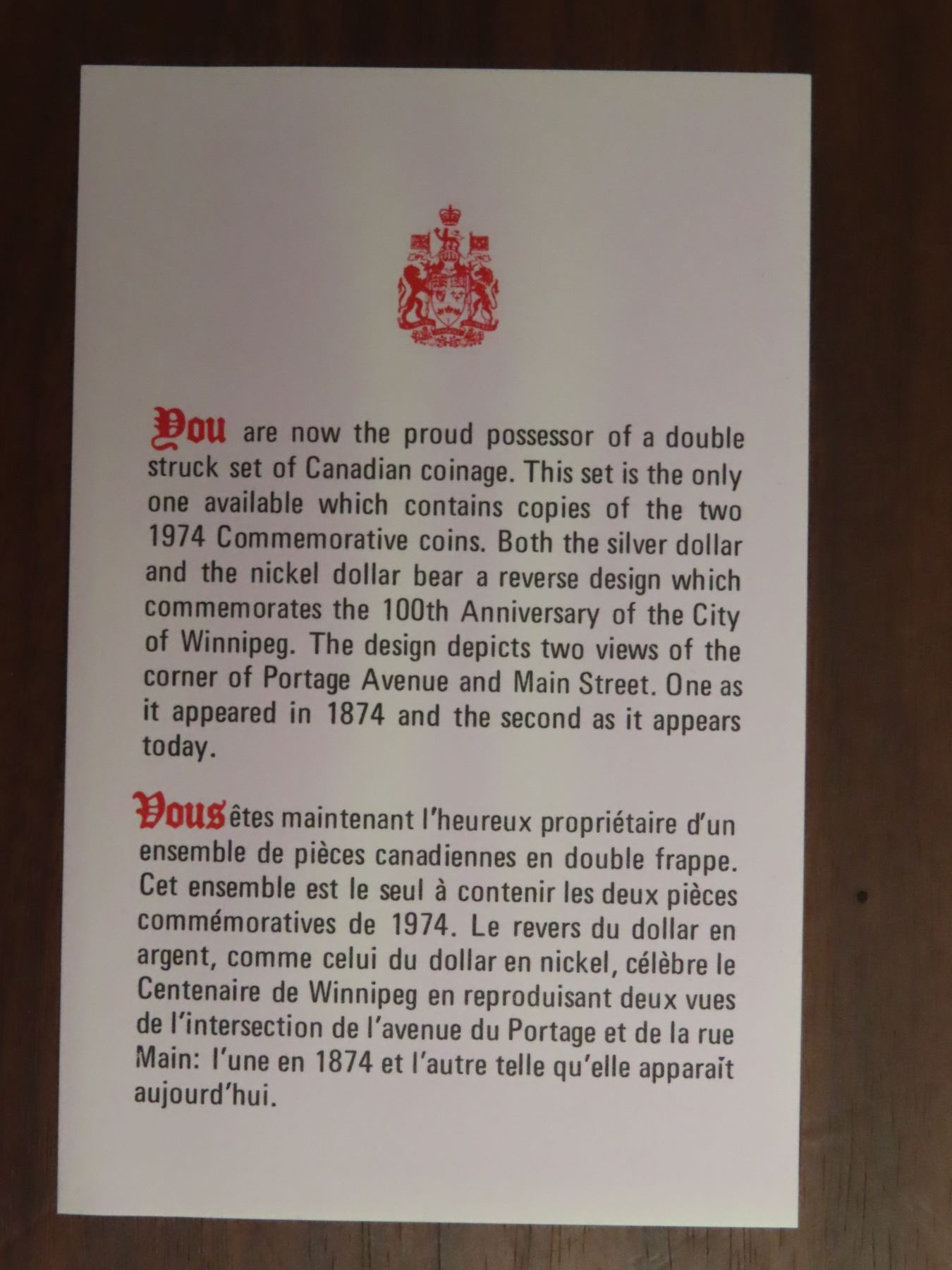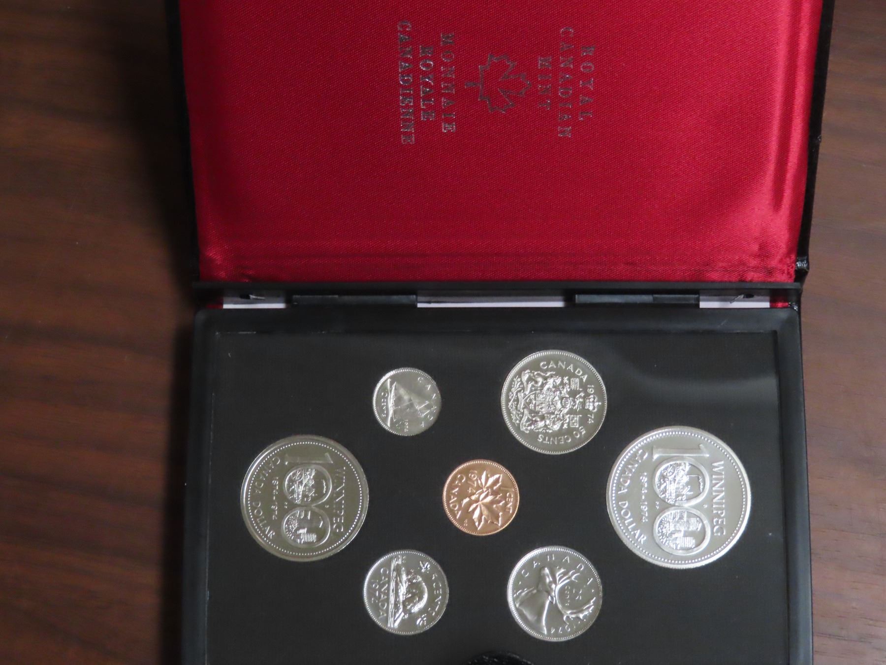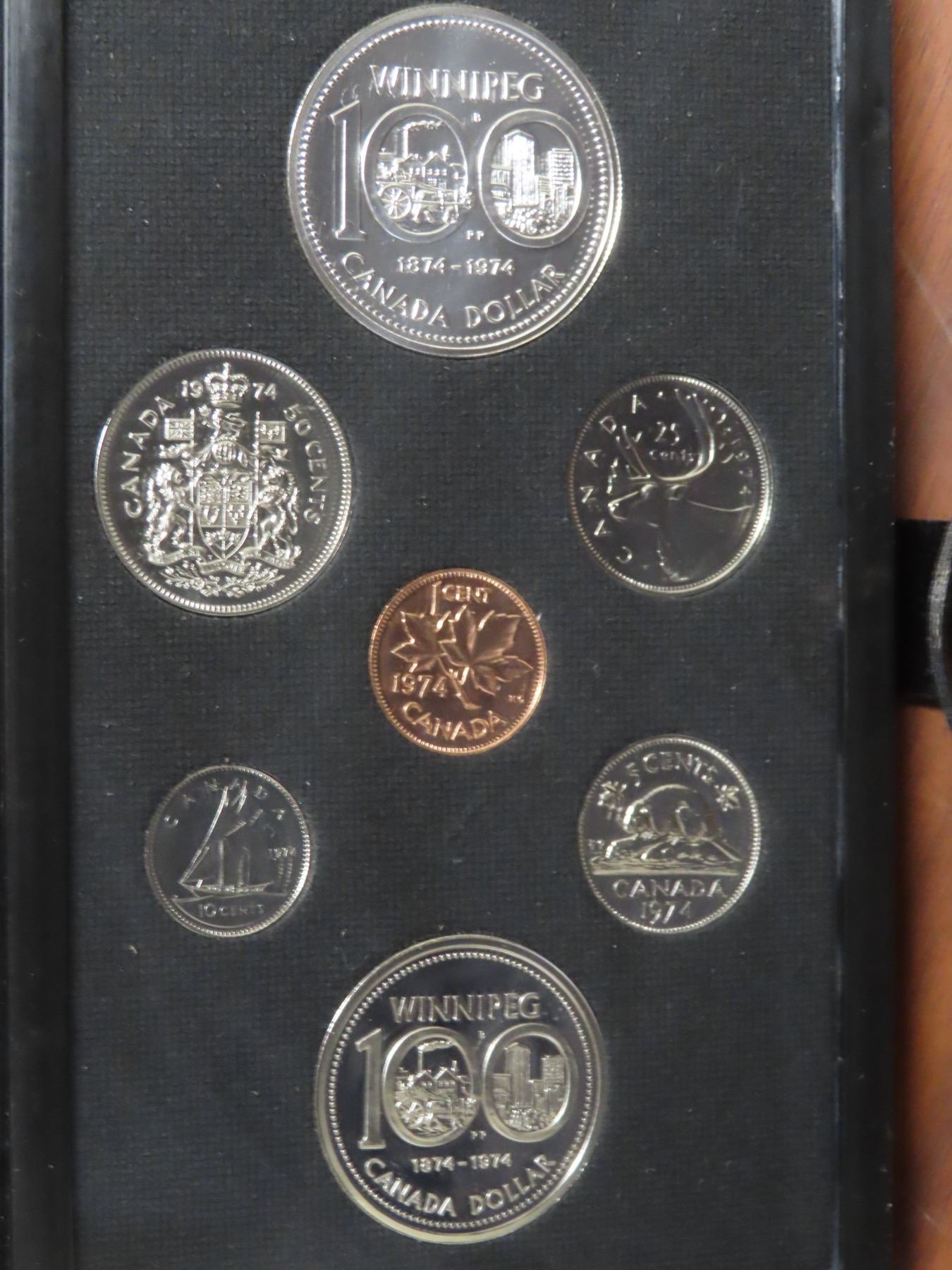 1974 Double Dollar Specimen Set. Bright White Silver Dollar celebrates Winnipeg’s 100th Birthday. Housed in its original case of issue.