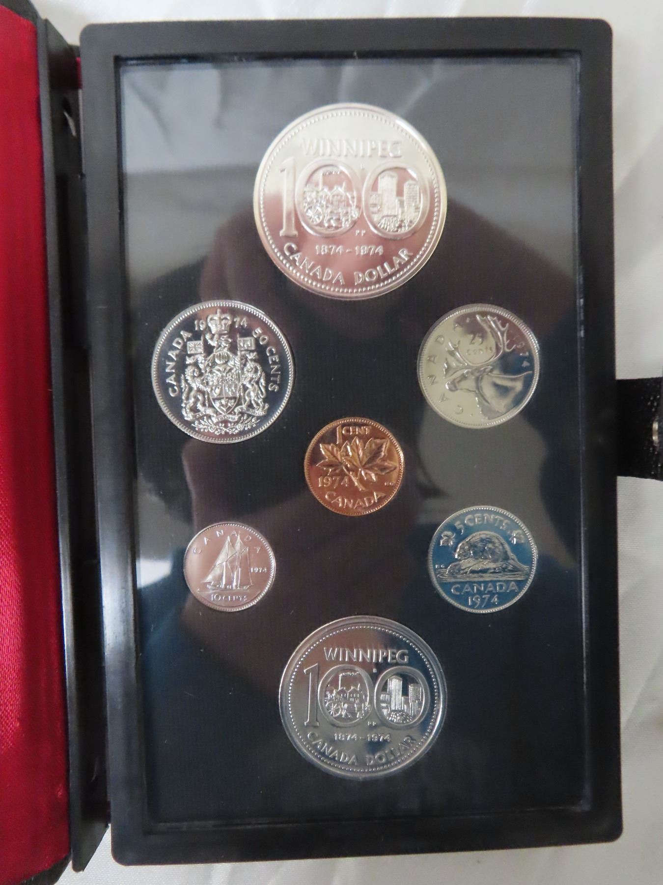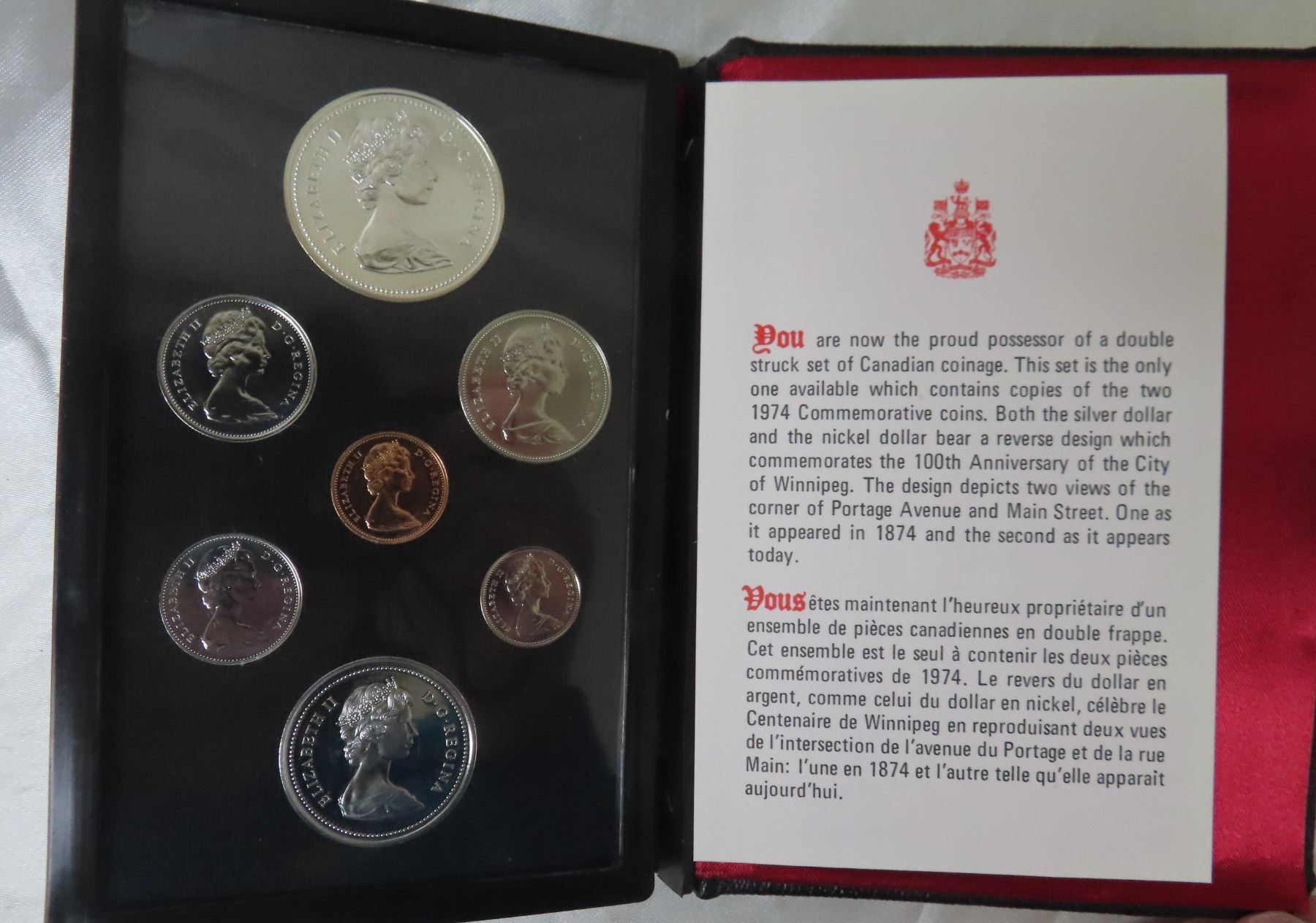 1974 Double Dollar Specimen Set. The Silver Dollar & Nickel Dollar commemorate the 100th Anniversary of Winnipeg. Housed in its original Royal Canadian Mint case of issue.