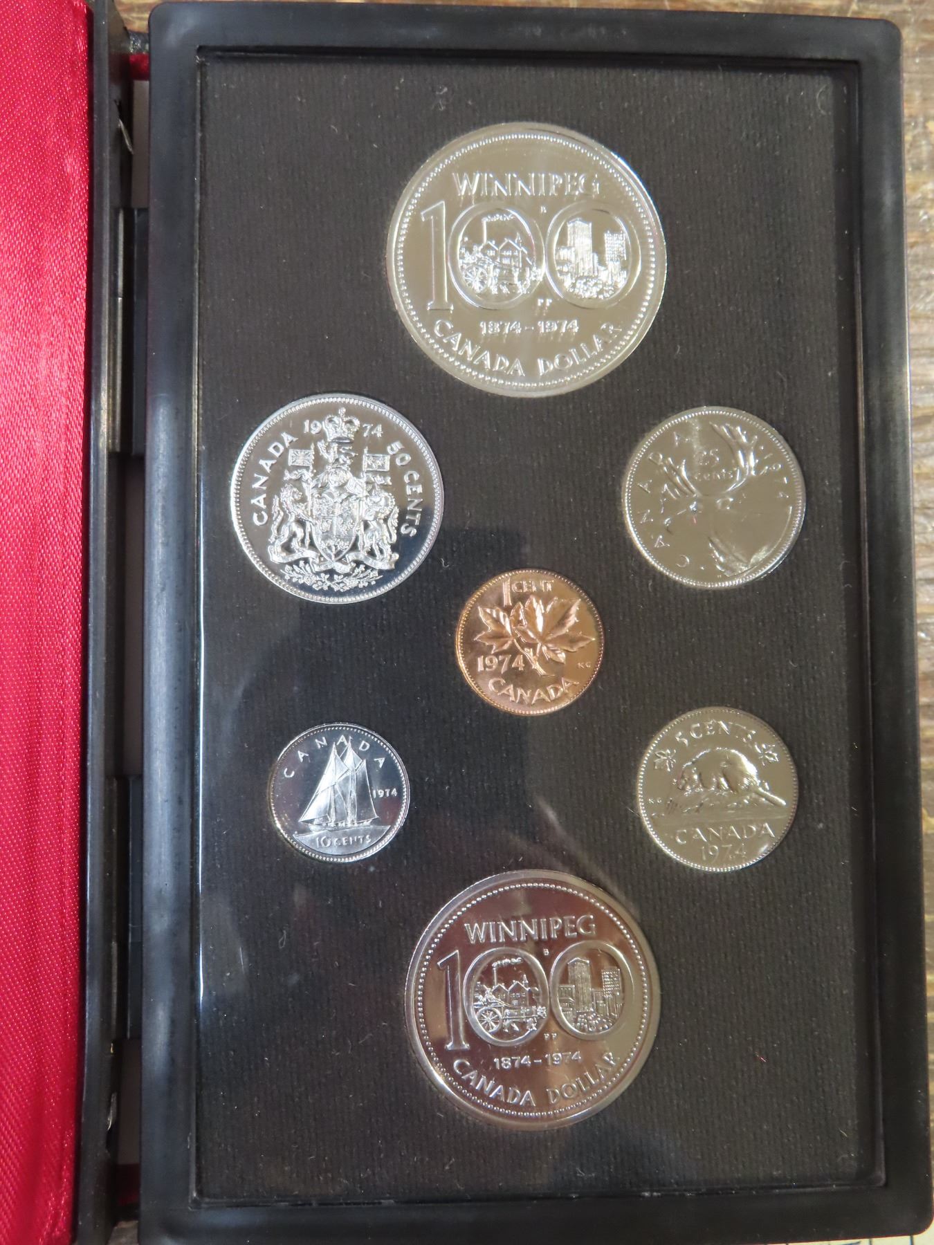 1974 Double Dollar Specimen Set. The Silver Dollar commemorates the 100th Anniversary of Winnipeg. Housed in its original Royal Canadian Mint case of issue. Incudes Certificate of Authenticity.