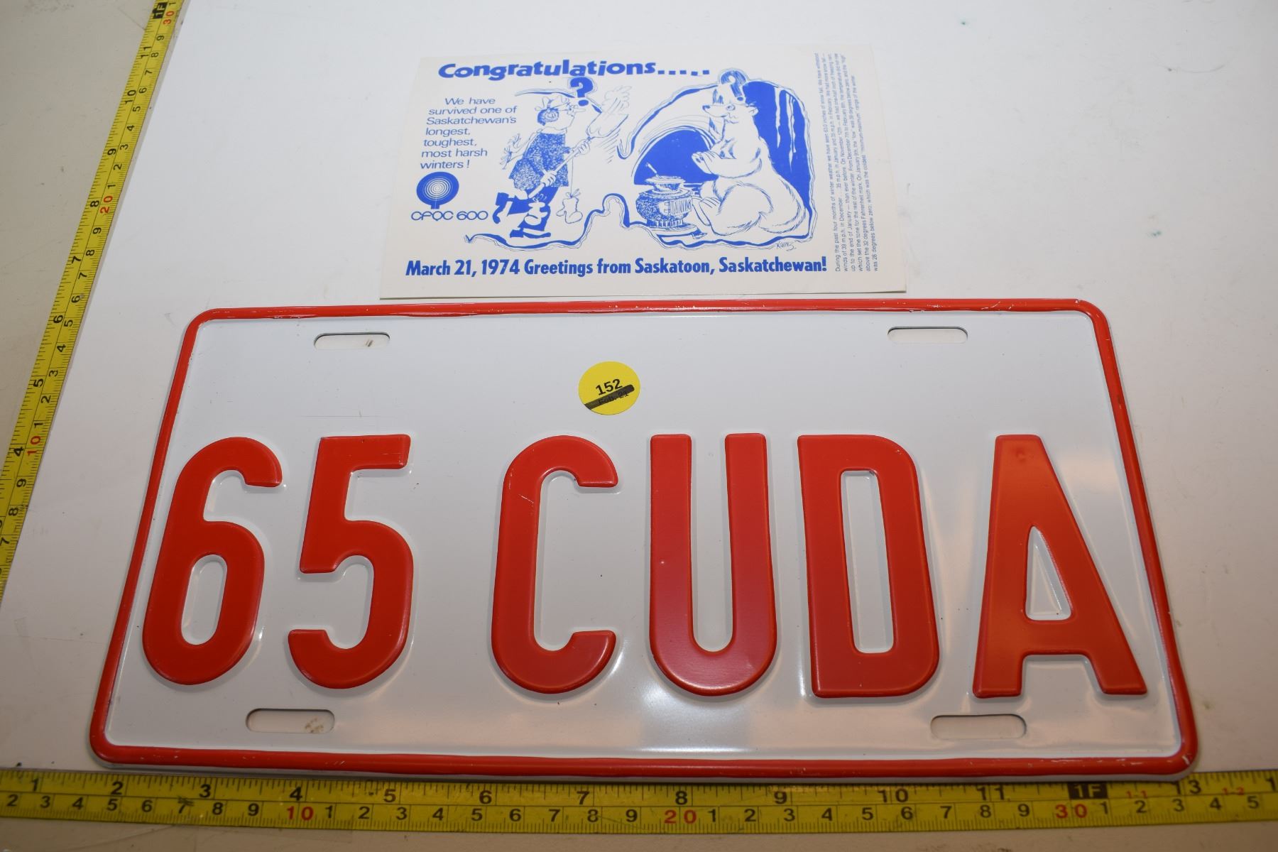 1974 Saskatoon Postcard, 1965 CUDA License Plate