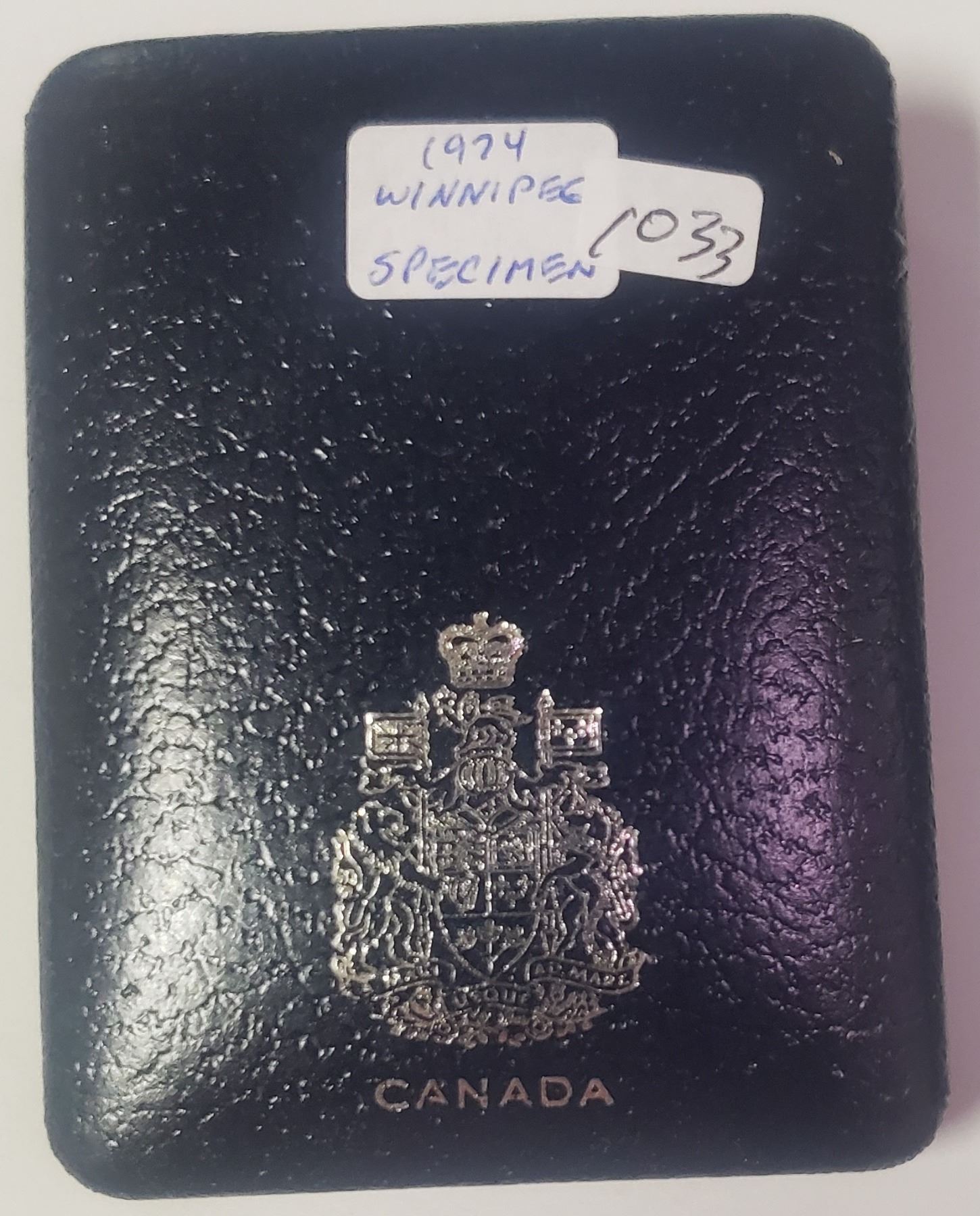 1974 Specimen Dollar that commemorates the 100th Anniversary of Winnipeg in 1874. In blue clamshell case. Specimen strike.