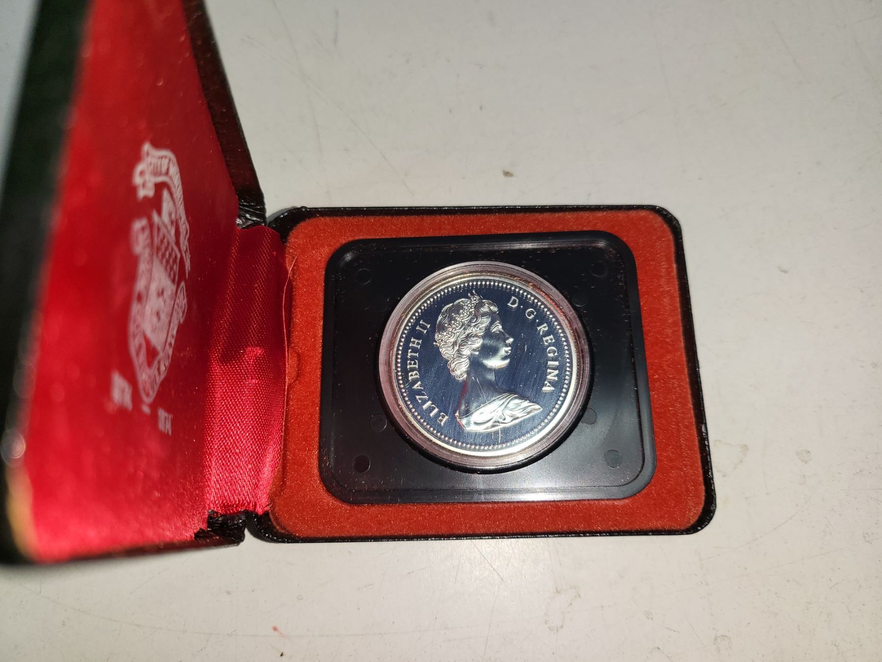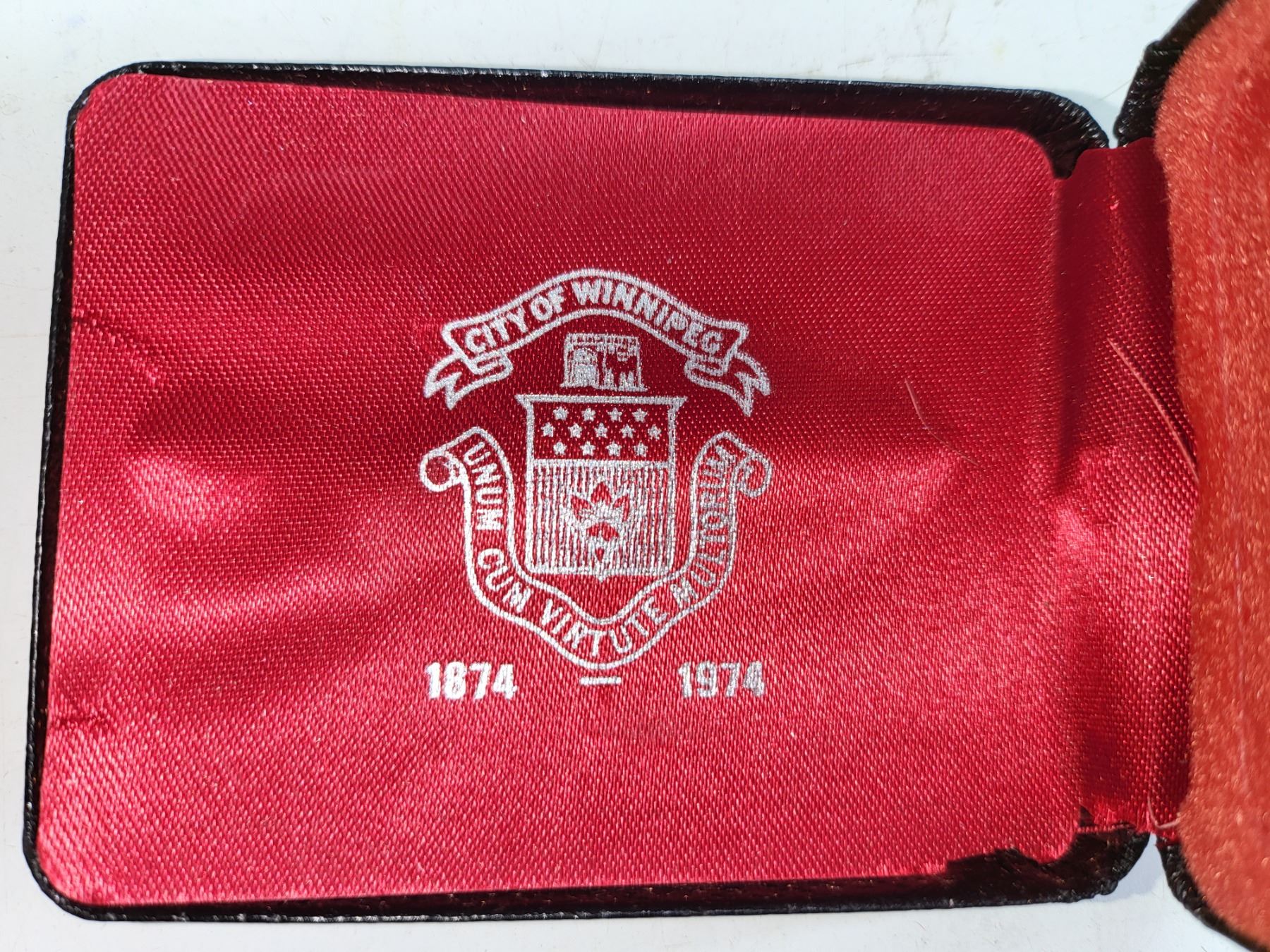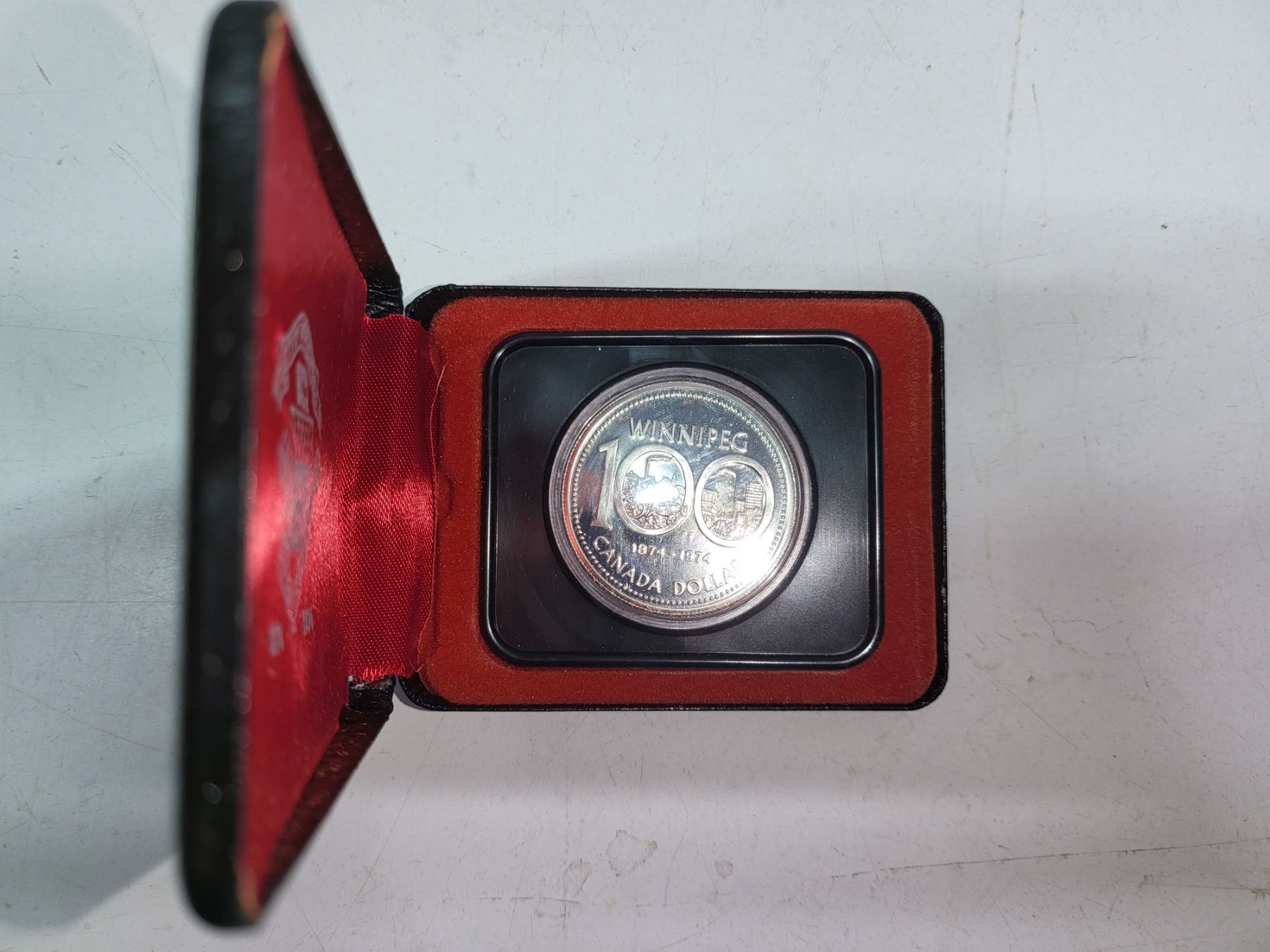 1974 Specimen Silver Dollar. The Silver Dollar commemorates the 100th Anniversary of Winnipeg. Housed in its original Royal Canadian Mint black clamshell case of issue.