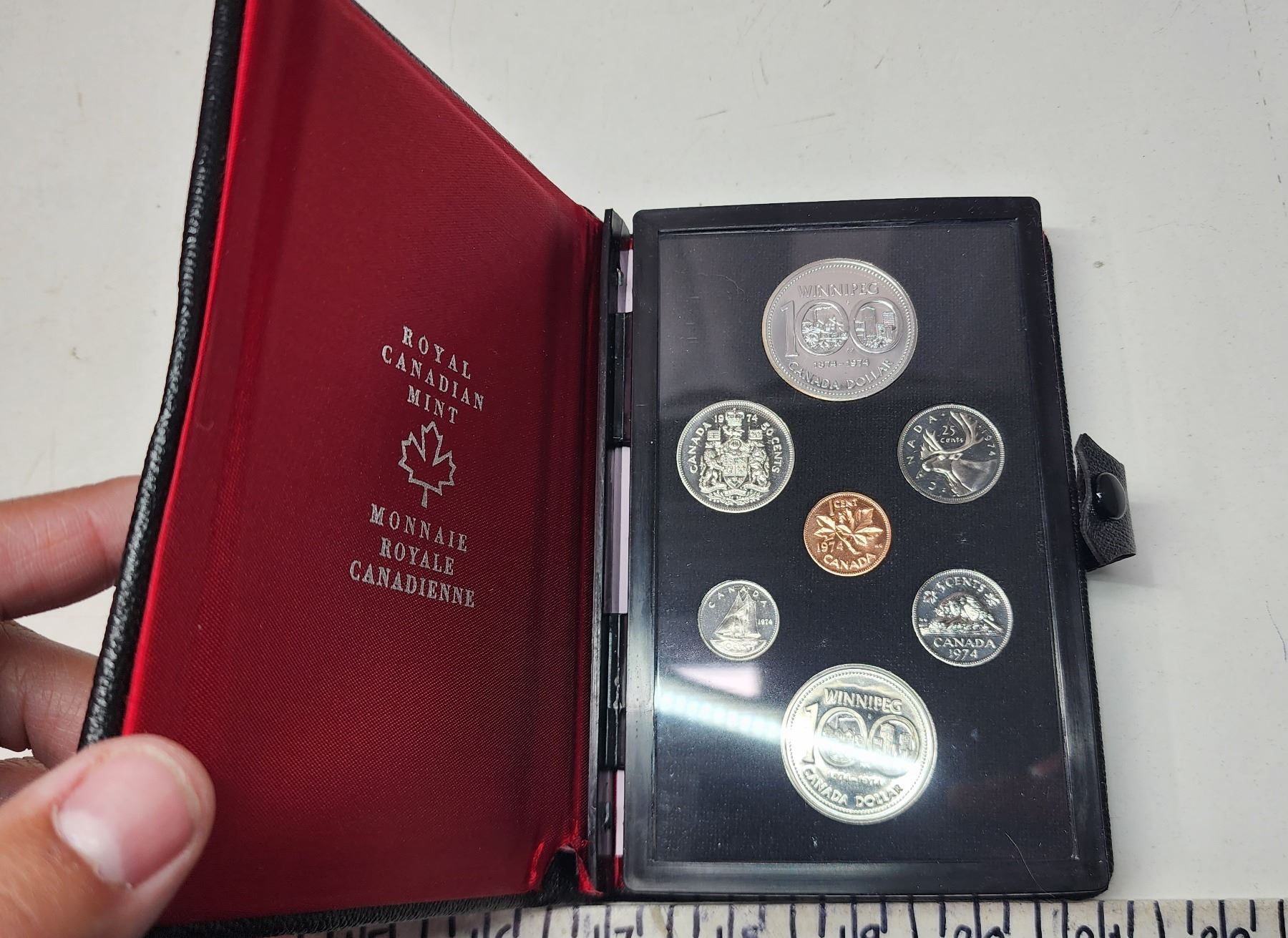 1974 Winnipeg Centennial Double Dollar Prestige Specimen Set. Silver Dollar commemorates the founding of Winnipeg. Bright White. Housed in its original RCM case of issue.