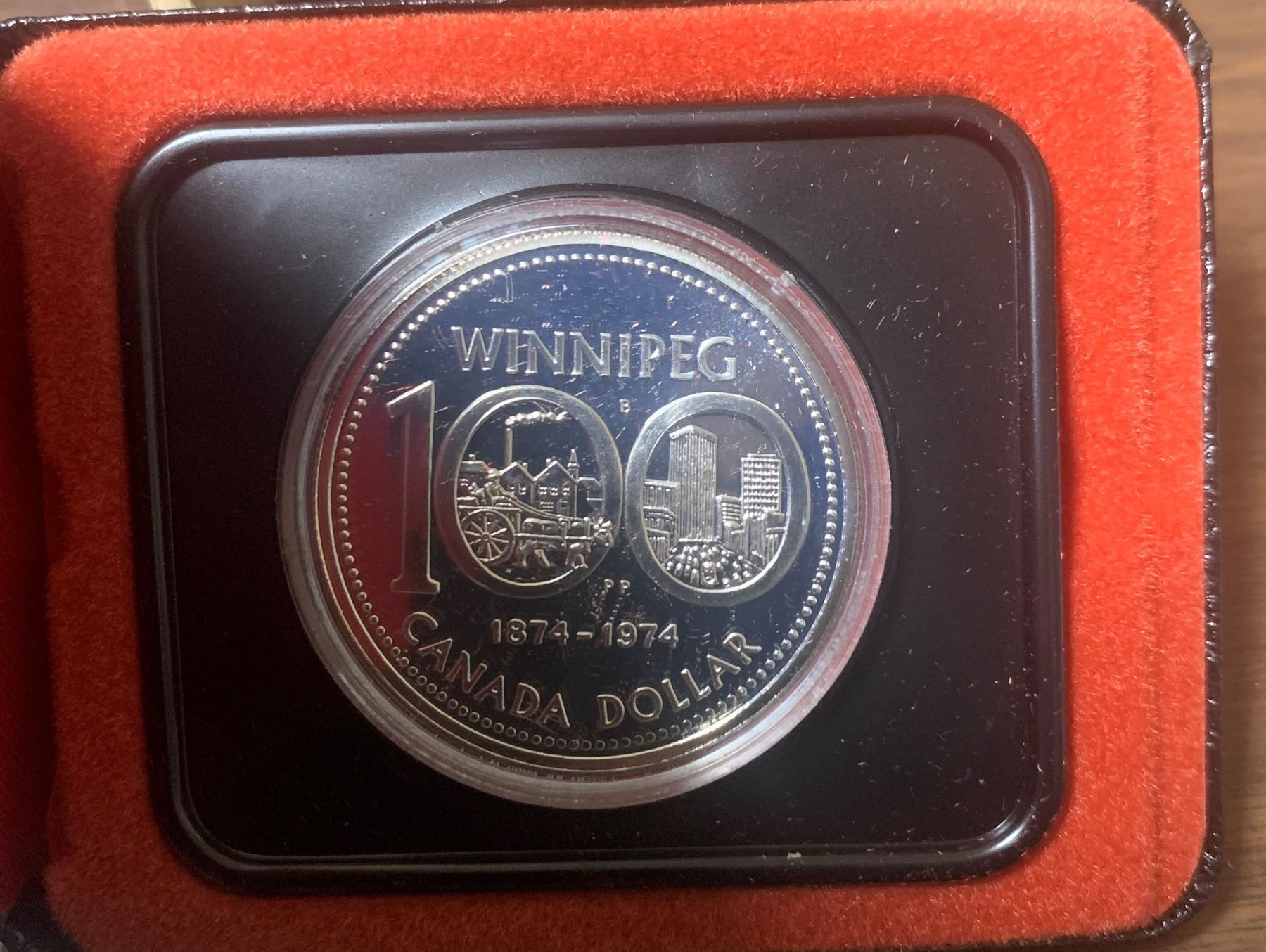 1974 Winnipeg Centennial Silver Dollar. Housed in its original RCM black case of issue. Specimen. Bright White.