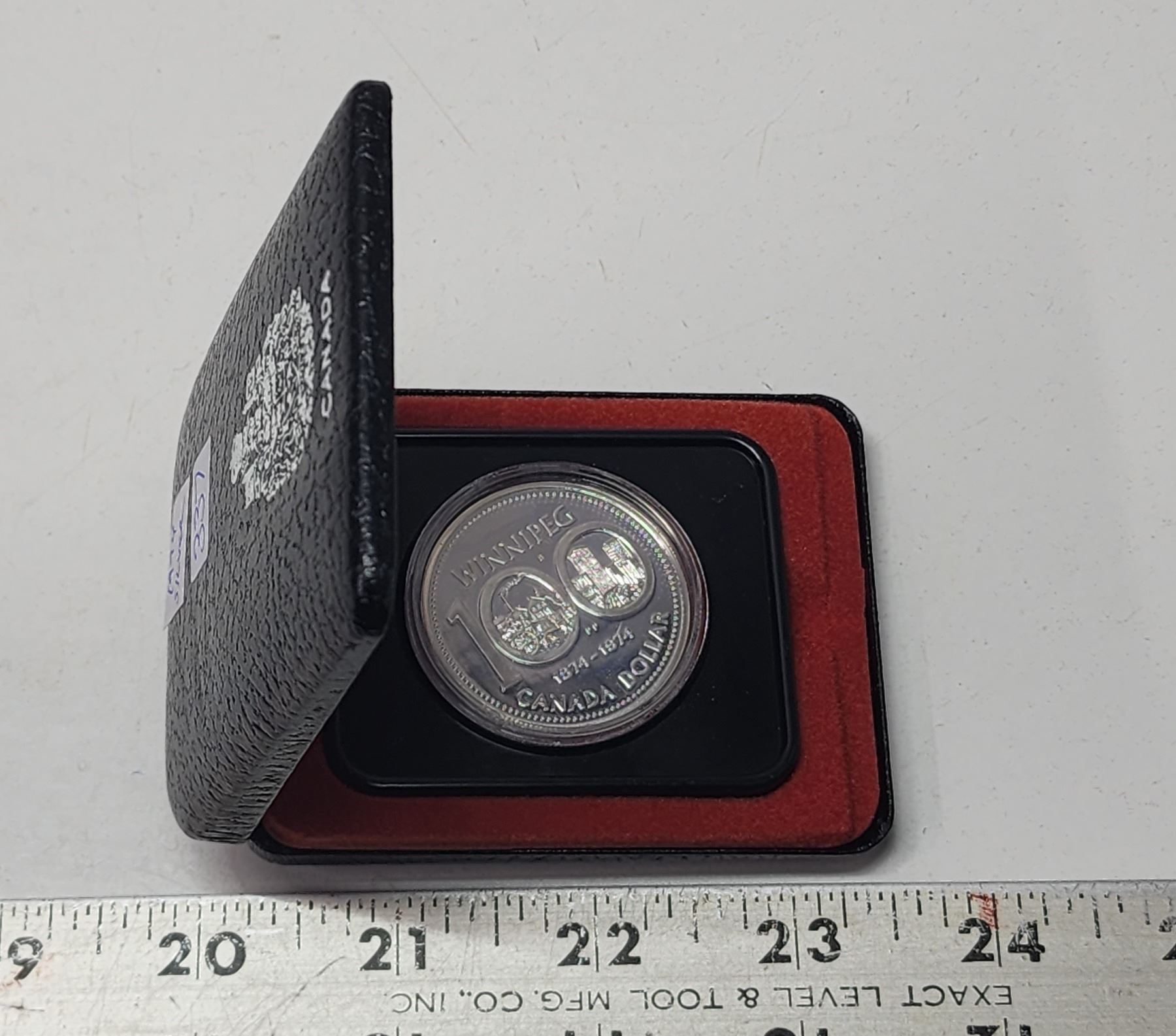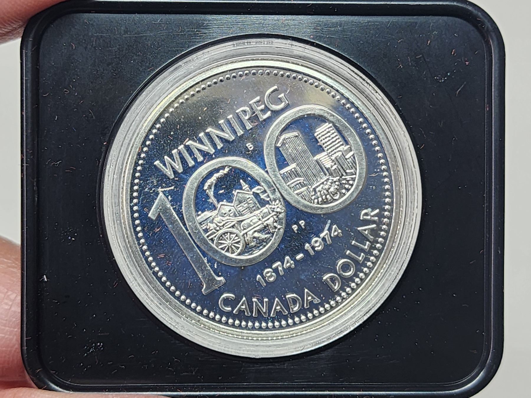 1974 Winnipeg Centennial Silver Dollar. Housed in its original black case of issue. Specimen. Bright White.
