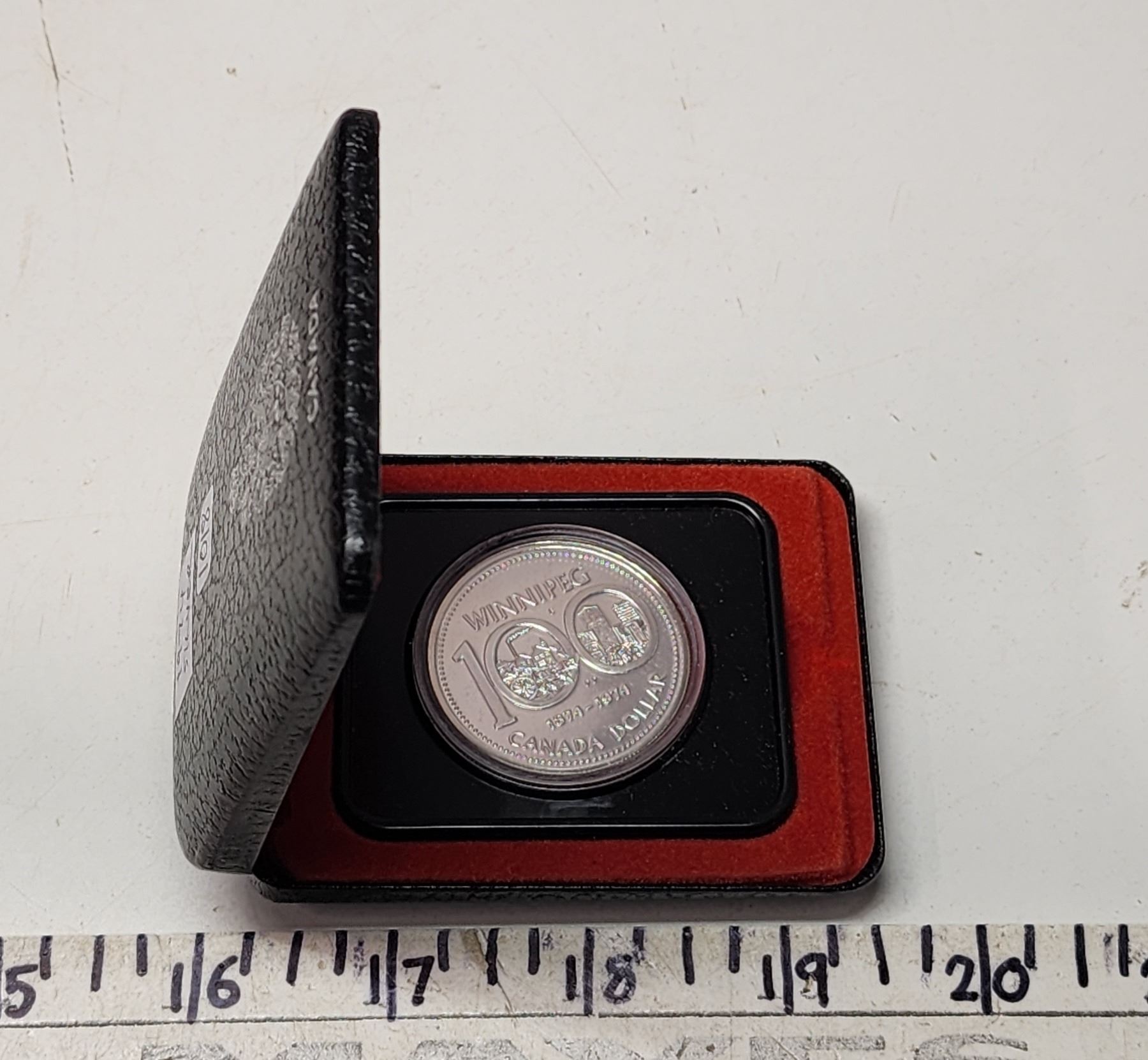 1974 Winnipeg Centennial Silver Dollar. Specimen. Bright White. Housed in its original RCM case of issue.