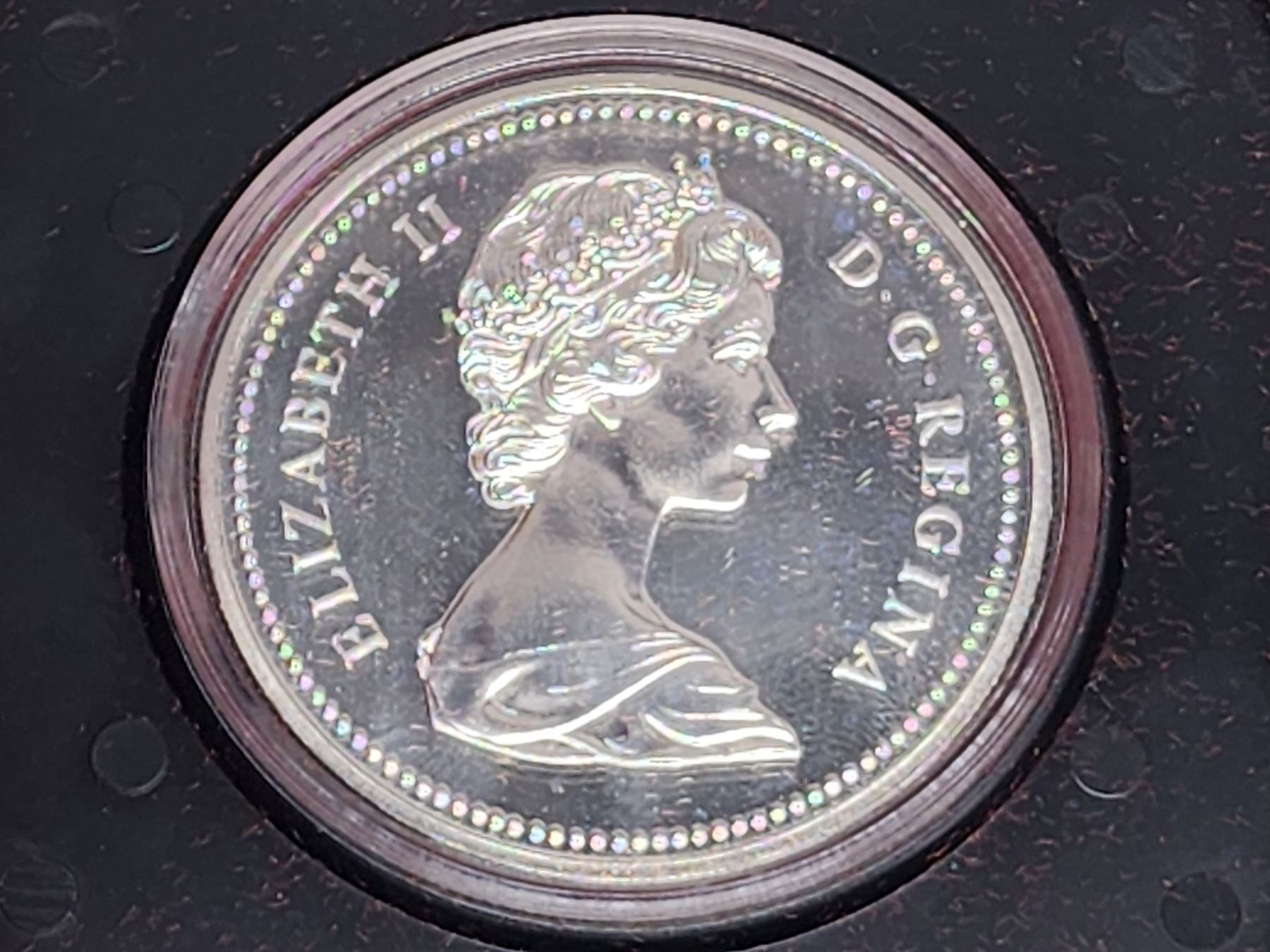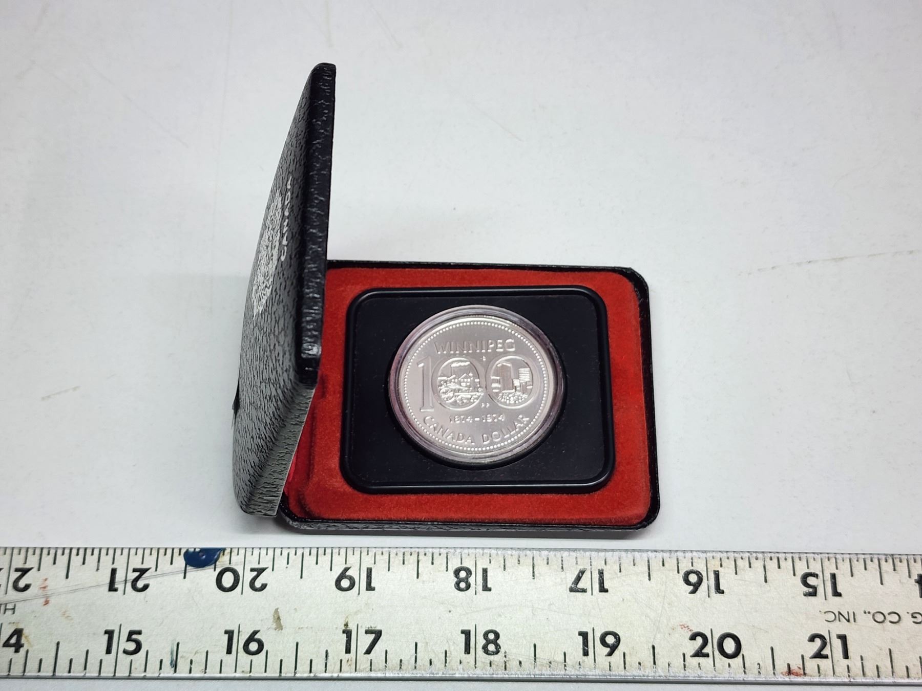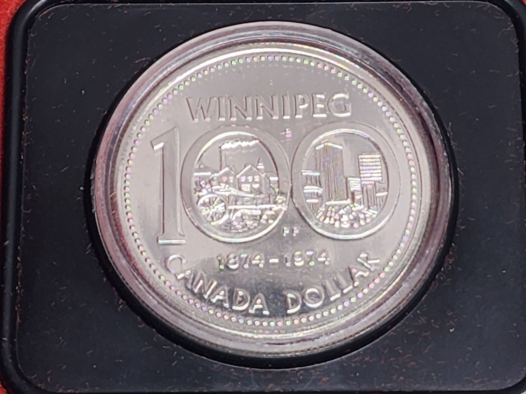 1974 Winnipeg Centennial Silver Dollar. Specimen. Bright White. Housed in its original black clamshell case of issue.