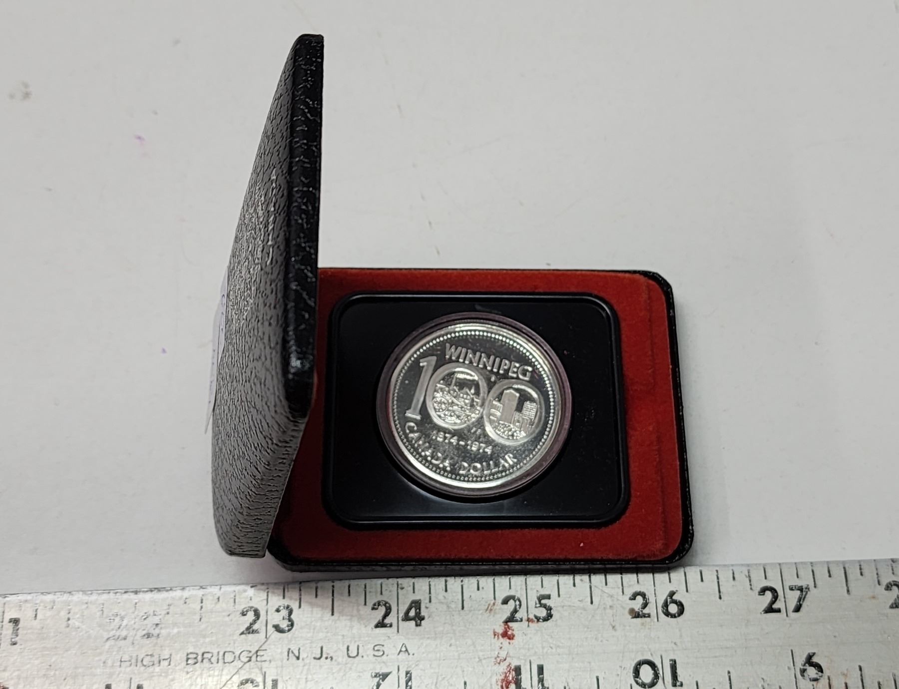 1974 Winnipeg Centennial Silver Dollar. Specimen. Bright White. Housed in its original black clamshell case of issue.