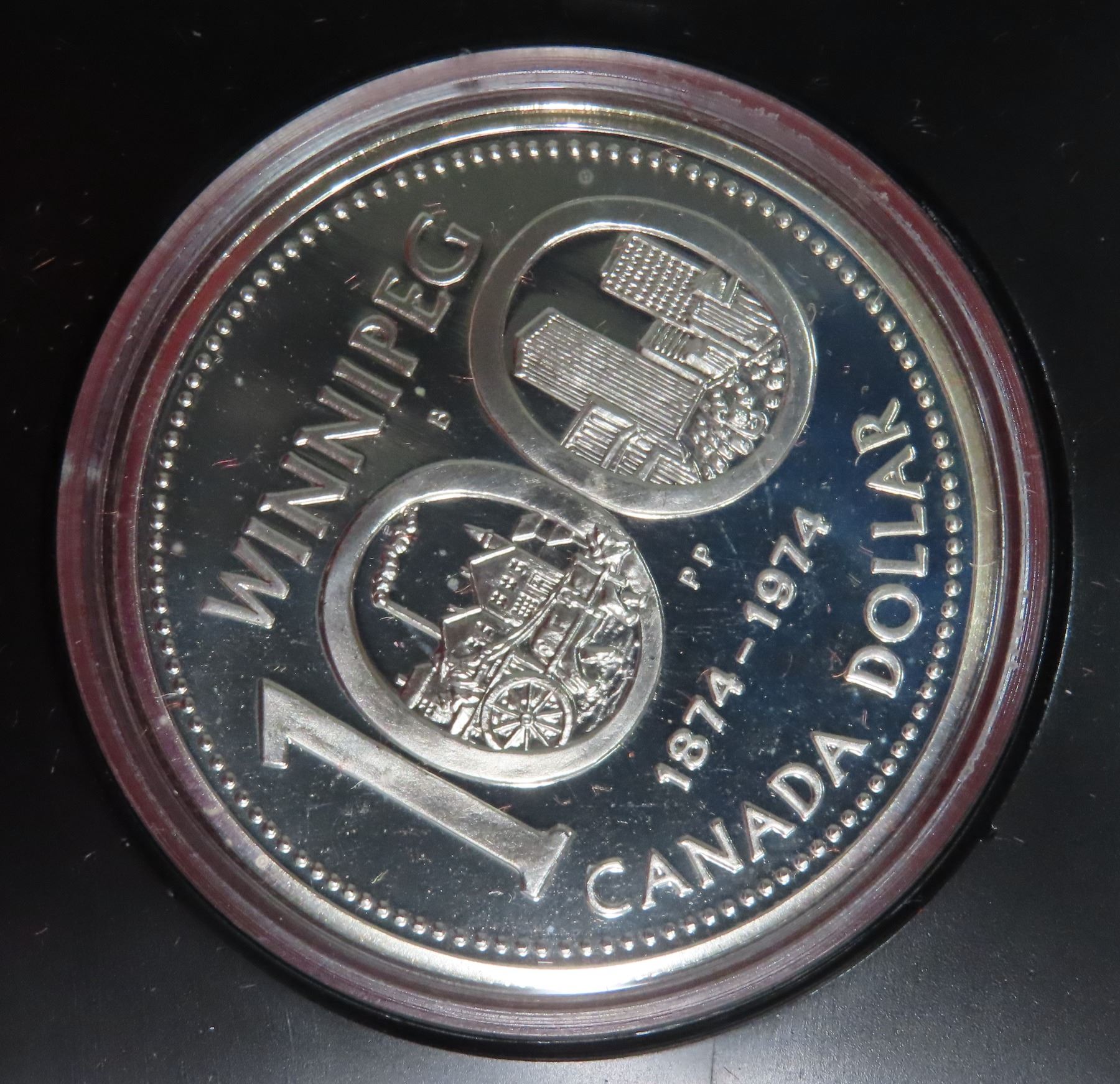 1974 Winnipeg Centennial Specimen Nickel Dollar. Bright White. Housed in its original RCM blue clamshell case.