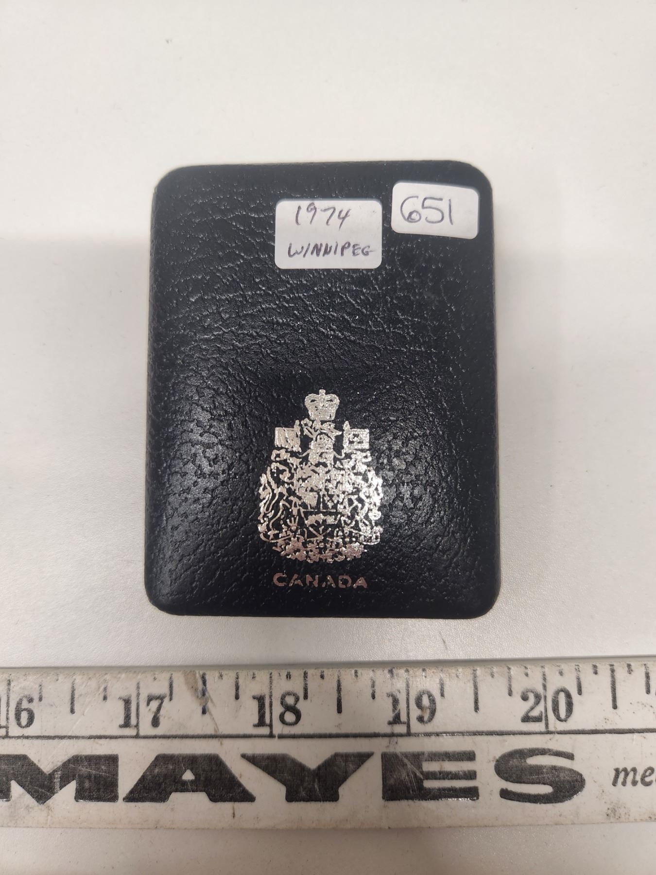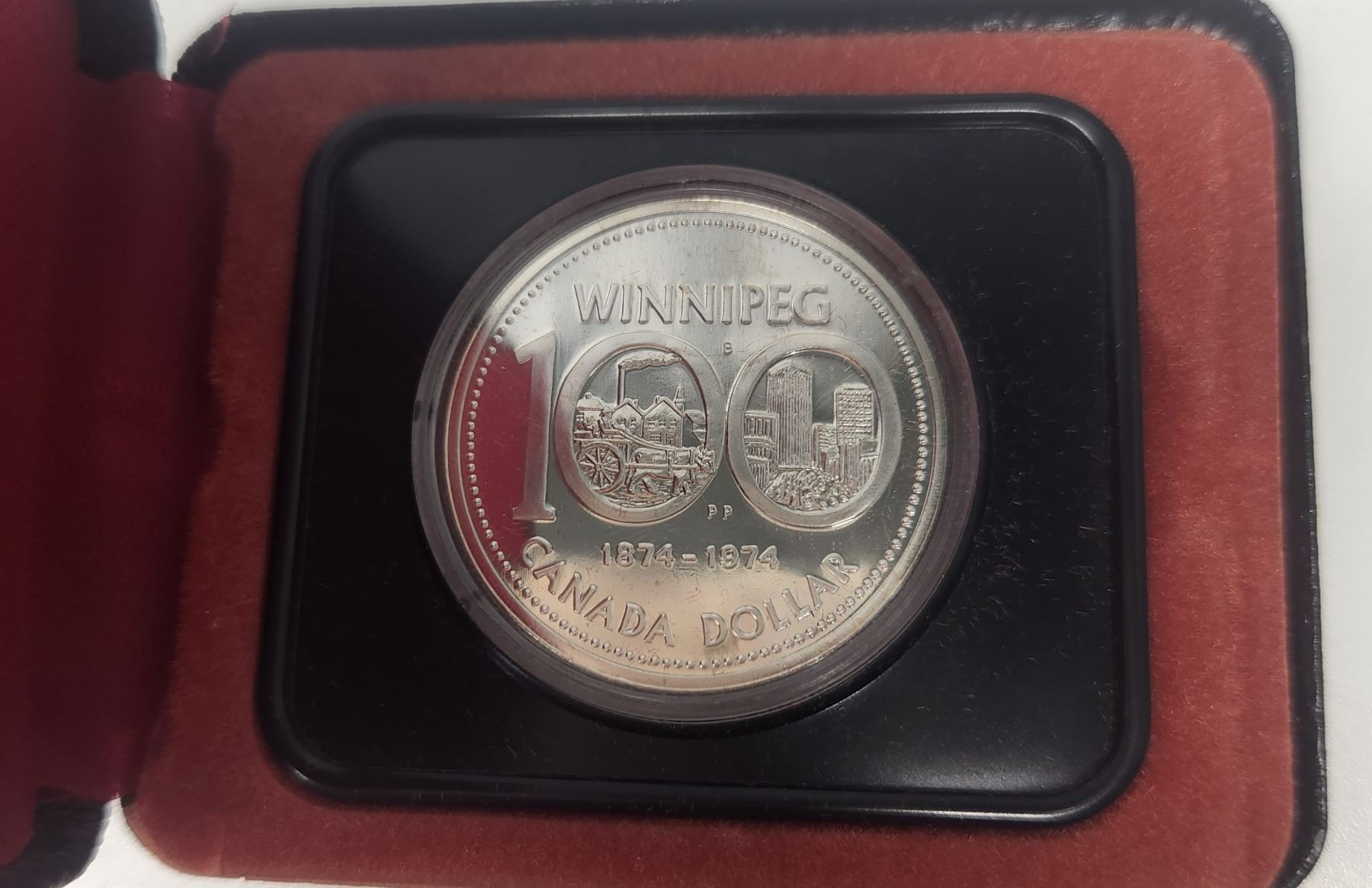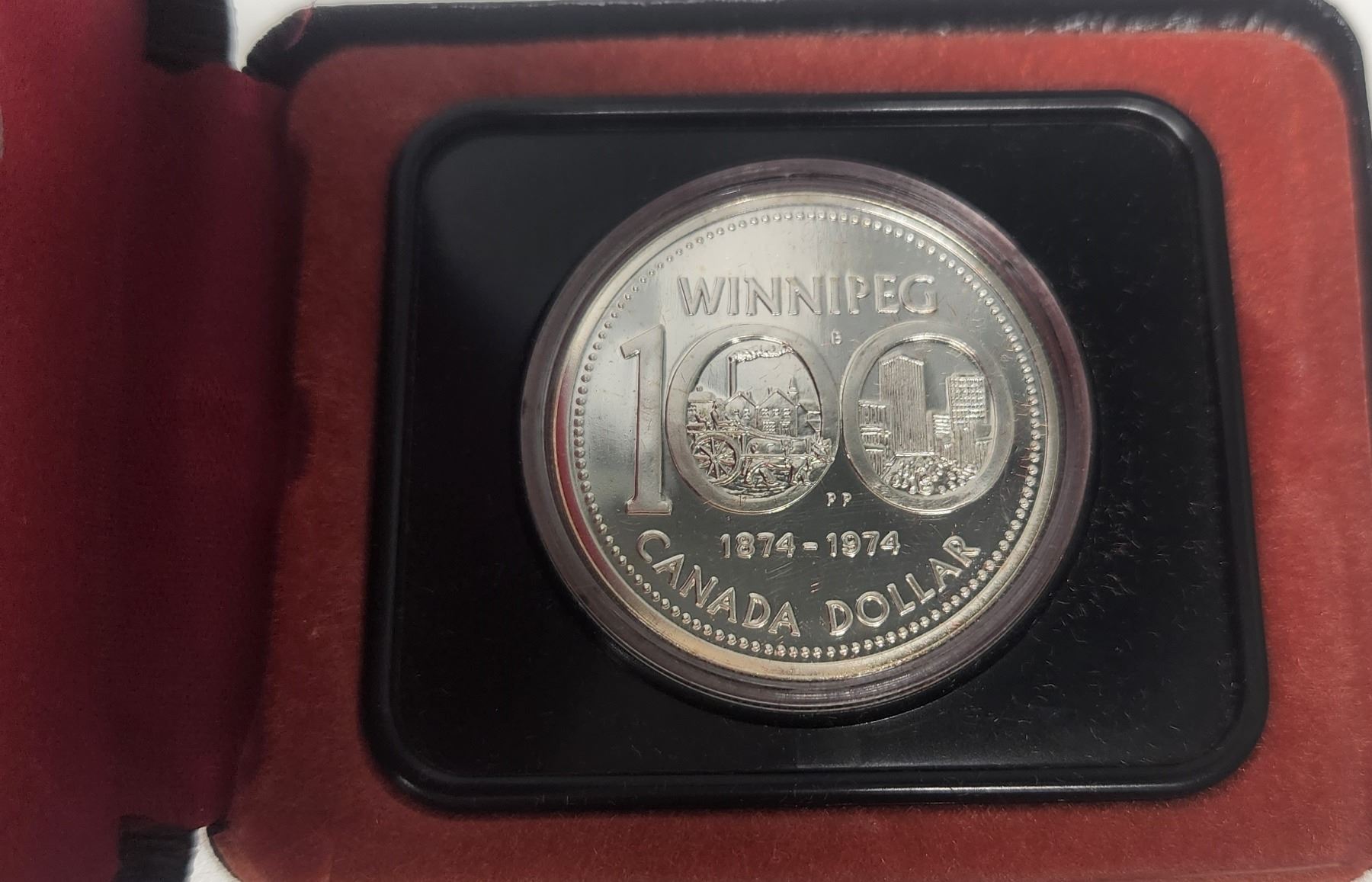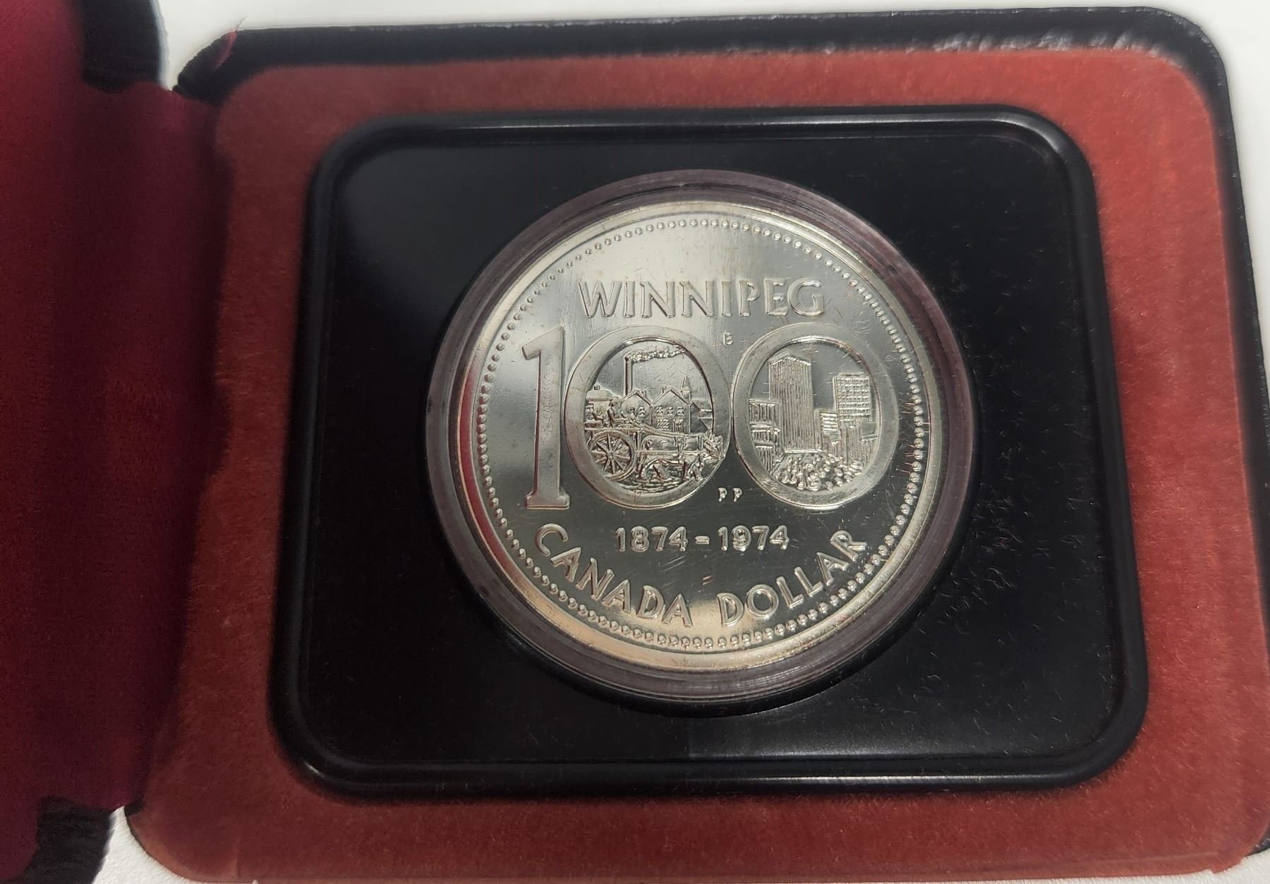 1974 Winnipeg Specimen Silver Dollar. Commemorates the founding of Winnipeg. Bright White. In black clamshell case of issue.