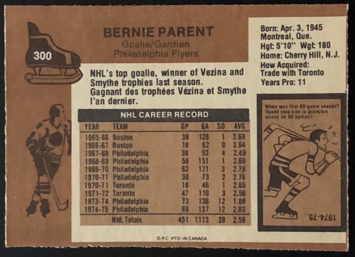 Card #300 hockey, NHL, vintage, OPC, hall of fame