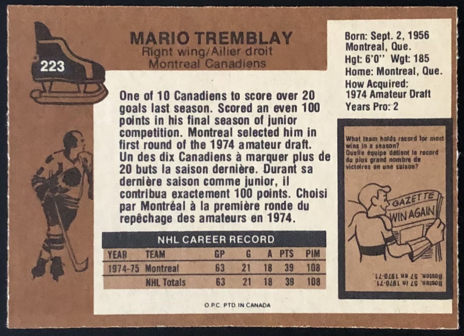 Card #223 hockey, NHL, vintage, OPC, rookie