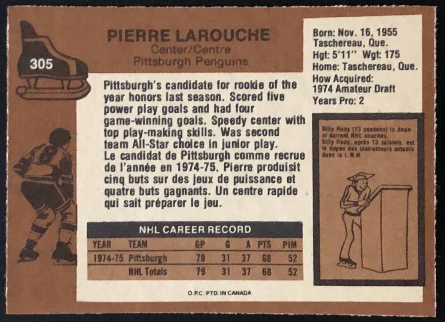 Card #305 hockey, NHL, vintage, OPC, rookie