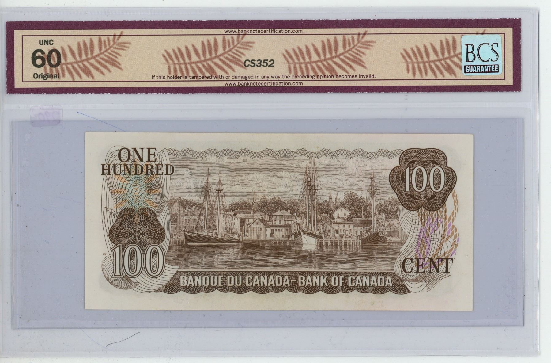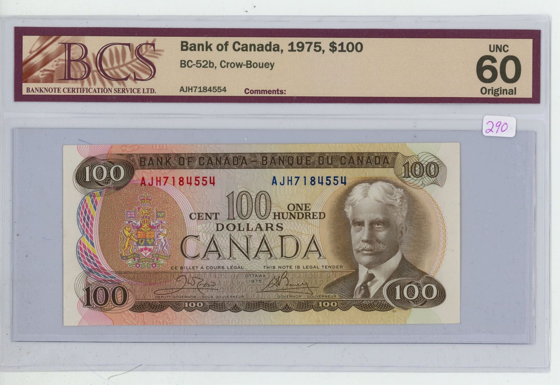 1975 BCS graded, Canadian 100 dollar bill - Crow/Bouey - AJH 7184554 - UNC60