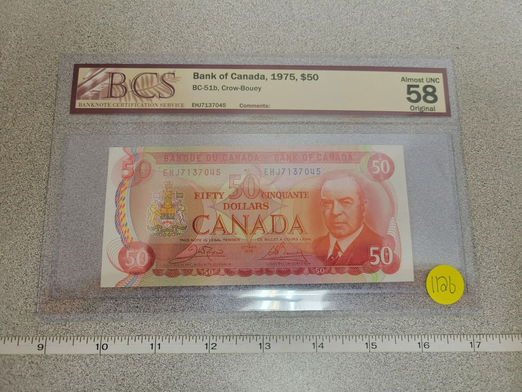 1975 Bank of Canada $50.00 fifty dollar bill BCS graded Almost UNC 58 Original