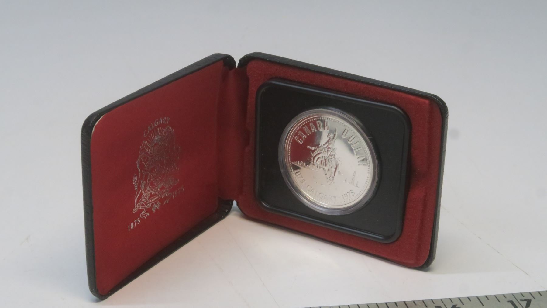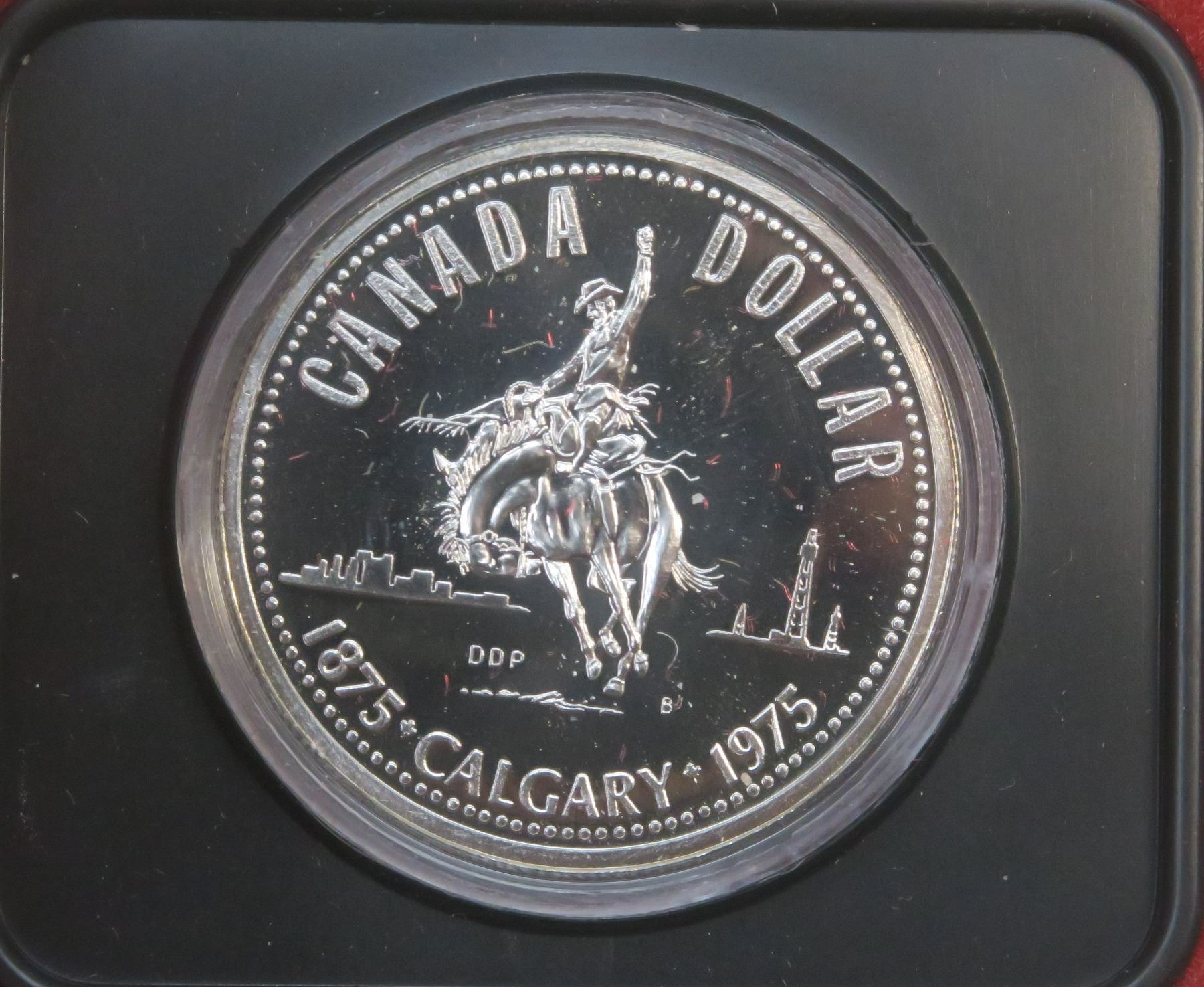 1975 Calgary Centennial Silver Dollar. Bright White. Housed in its original RCM black clamshell case of issue. Specimen.