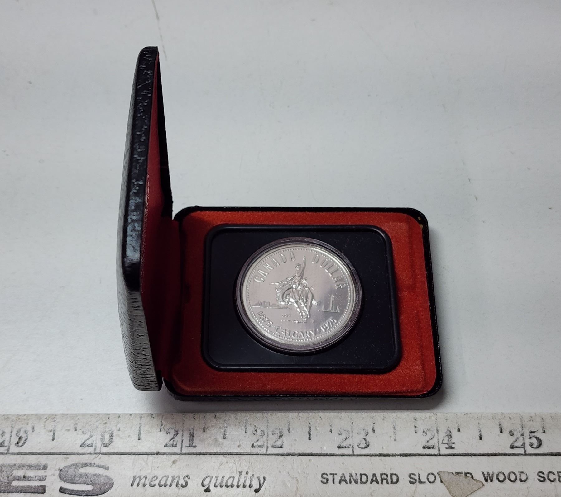 1975 Calgary Centennial Silver Dollar. Specimen. Bright White. Housed in its original RCM black case of issue.
