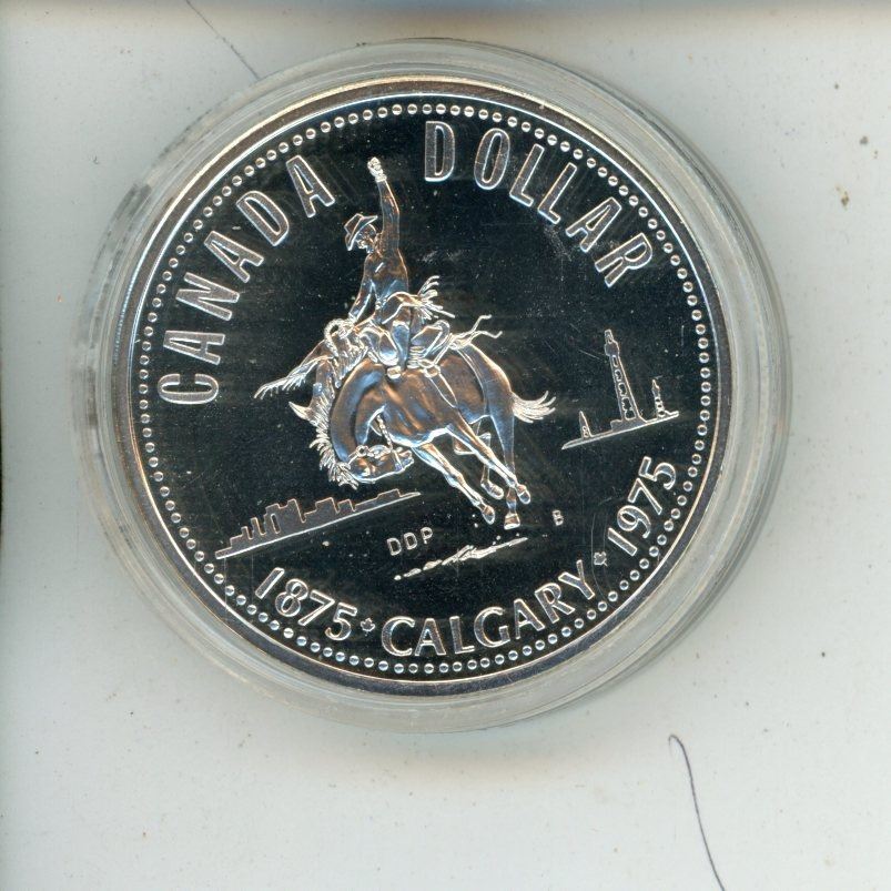 1975 Calgary Centennial Silver Dollar. Specimen. Popular cowboy on bucking bronco. Housed in its original hard plastic holder.