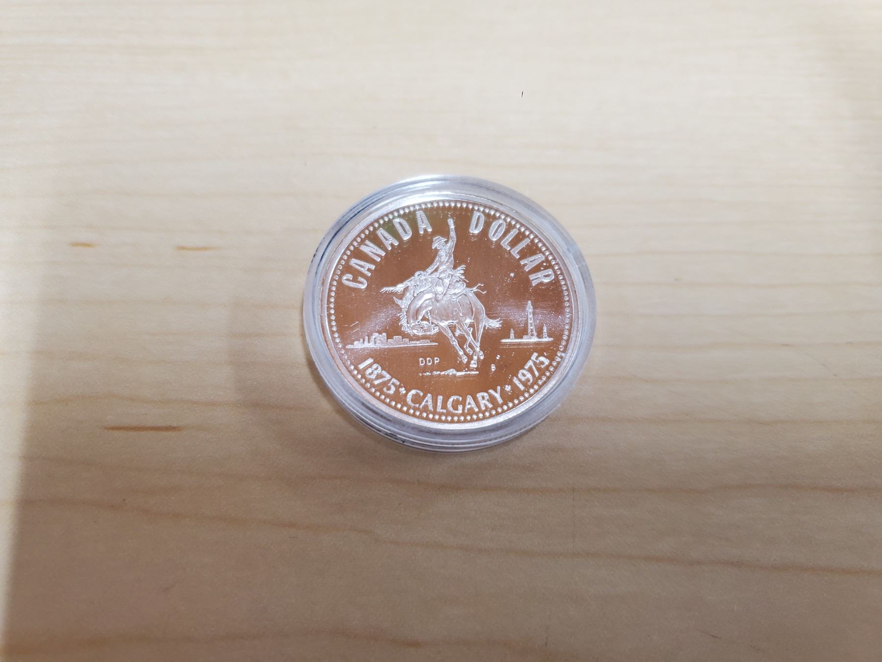 1975 Calgary Centennial Silver Dollar. Specimen. Popular cowboy on bucking bronco. Housed in its original hard plastic holder.