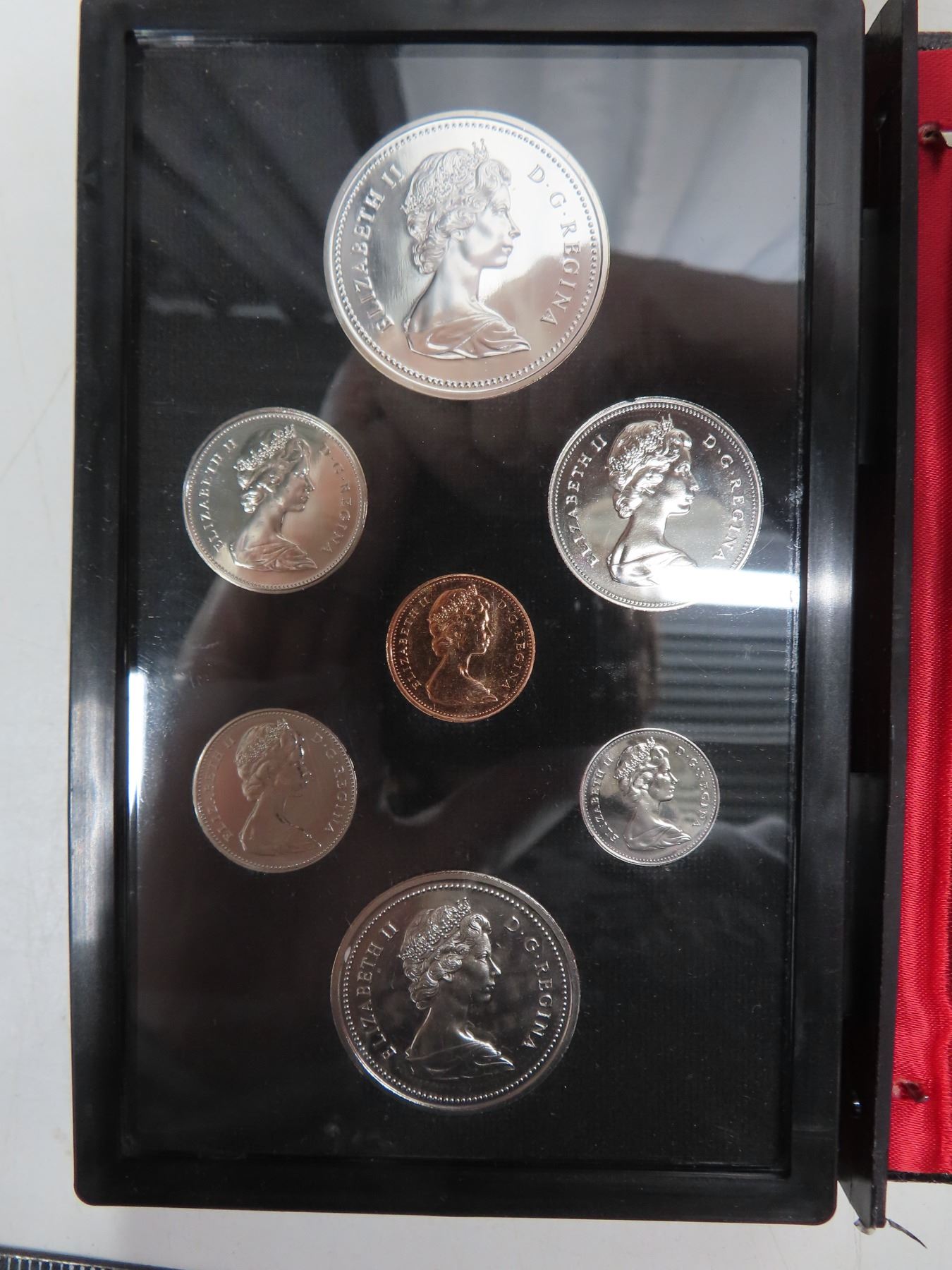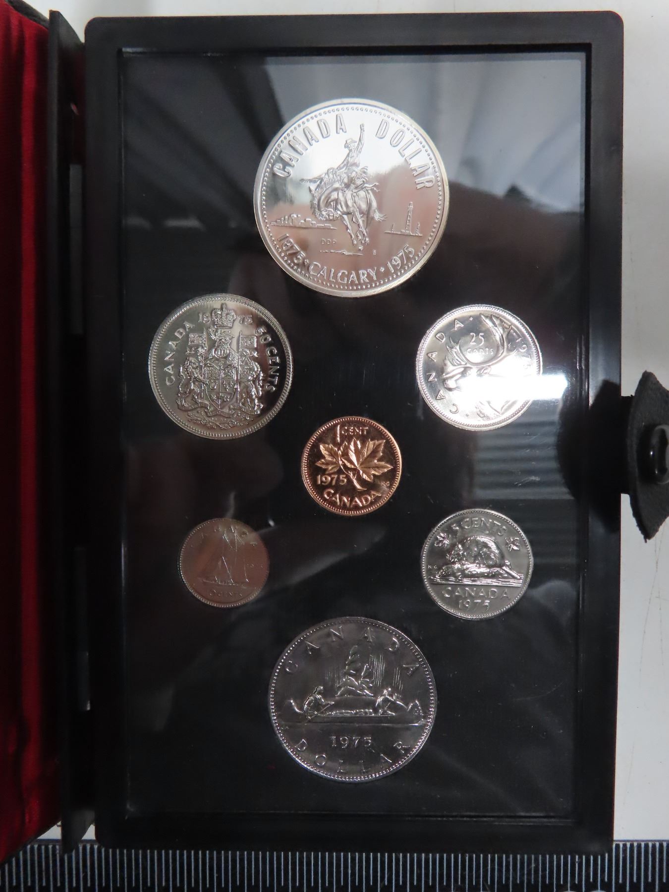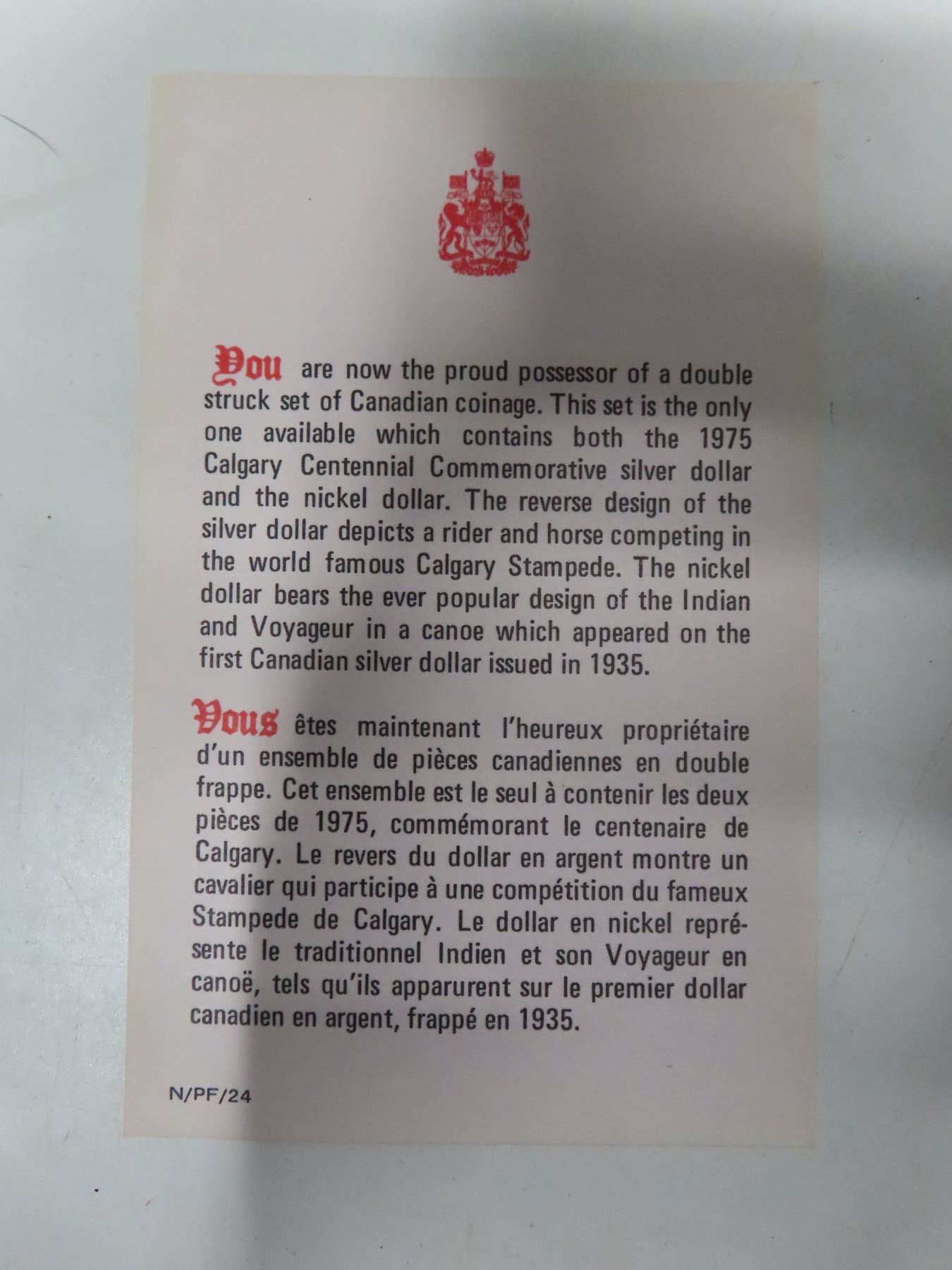 1975 Double Dollar Prestige Specimen Set. The Silver Dollar commemorates the 100th Anniversary of Calgary. Popular cowboy on bucking bronco. 7-coin set. Includes Certificate of Authenticity. Housed in its original Royal Canadian Mint case of issue.