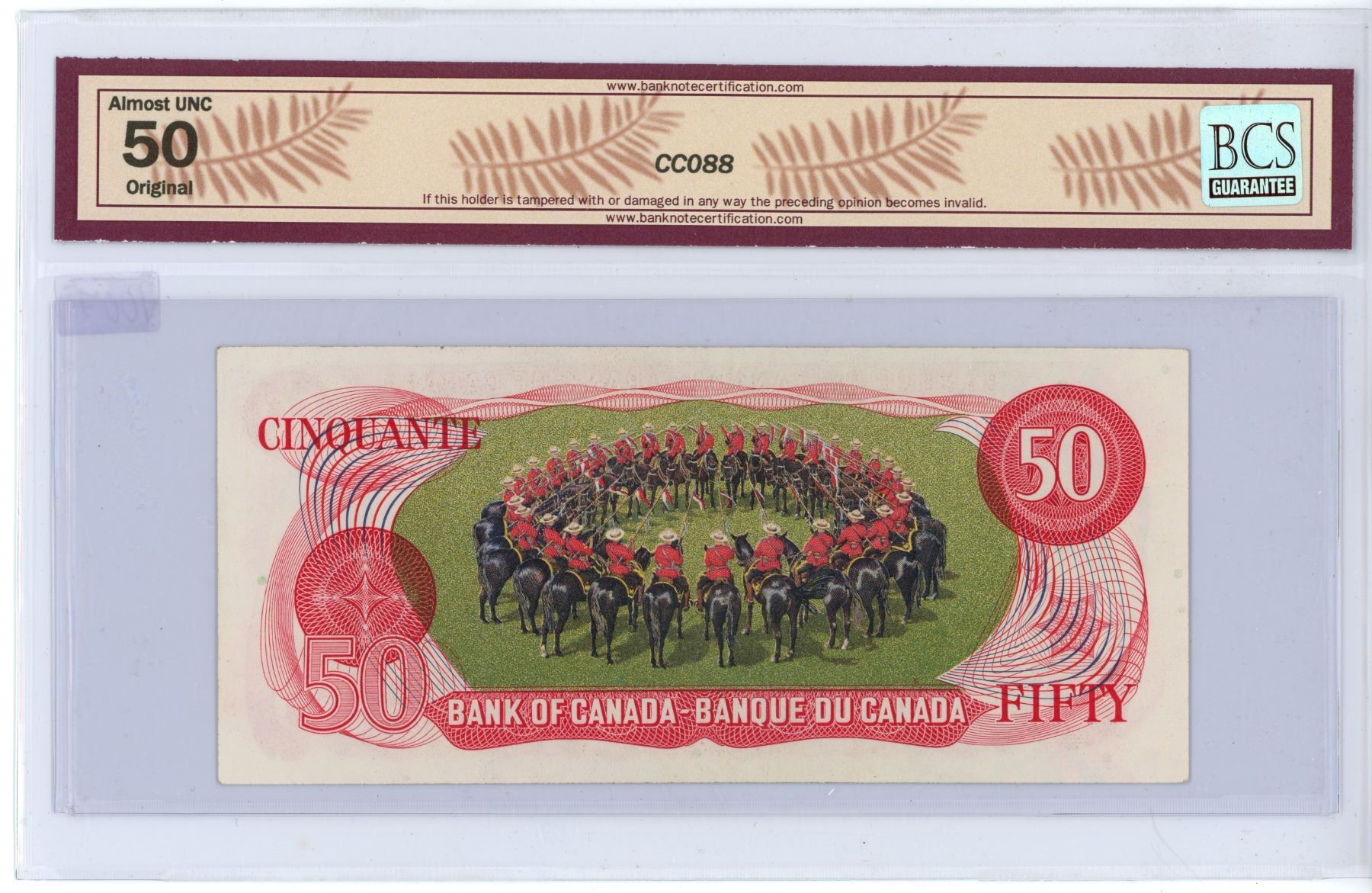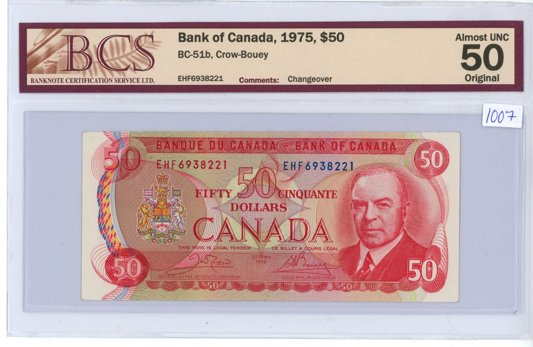1975 Graded Canadian $50 bill - Crow/Bouey - EHF prefix - 6938221 - UNC 50