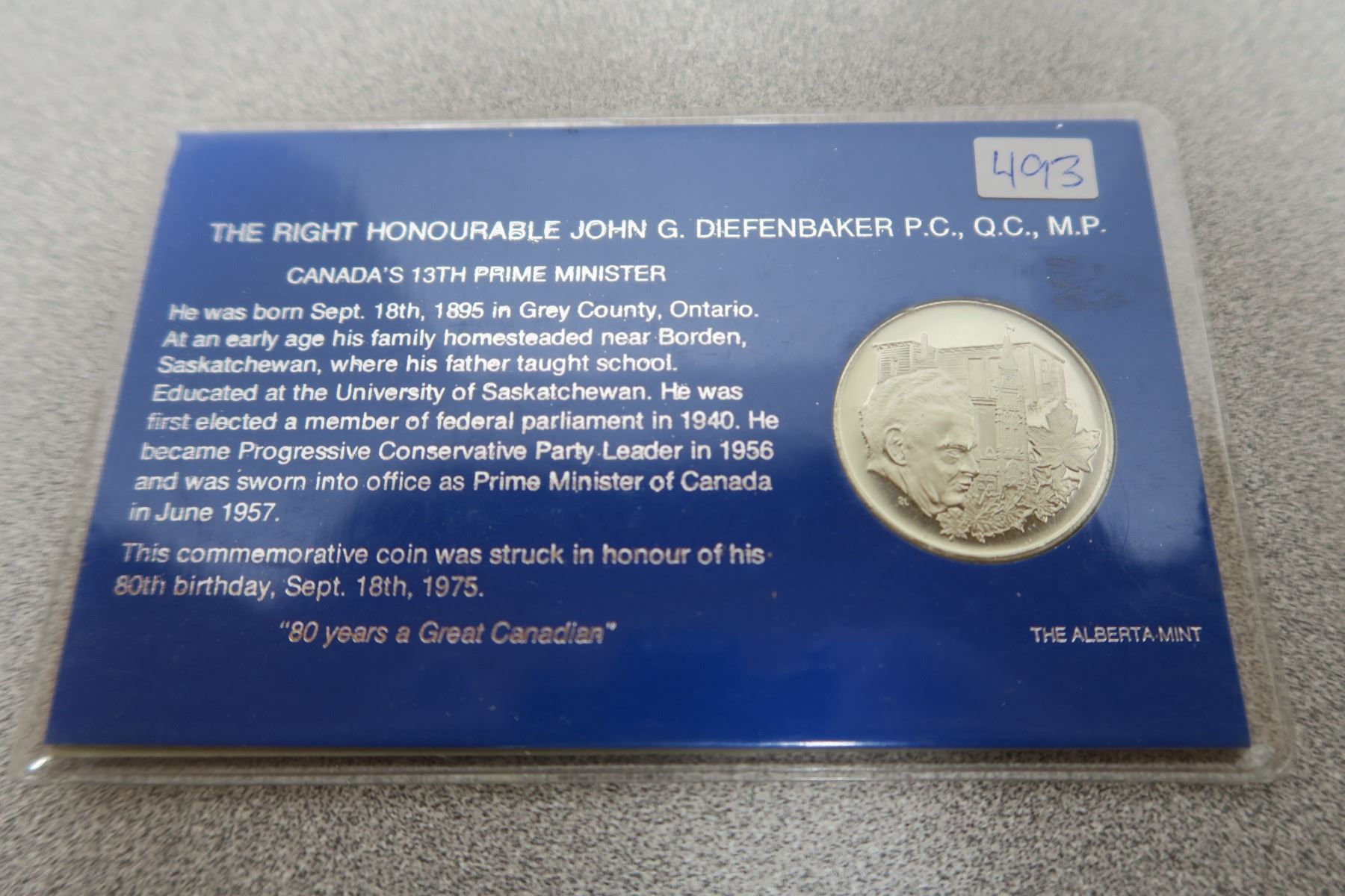 1975 John G. Diefenbaker Commemorative Coin - Alberta Mint