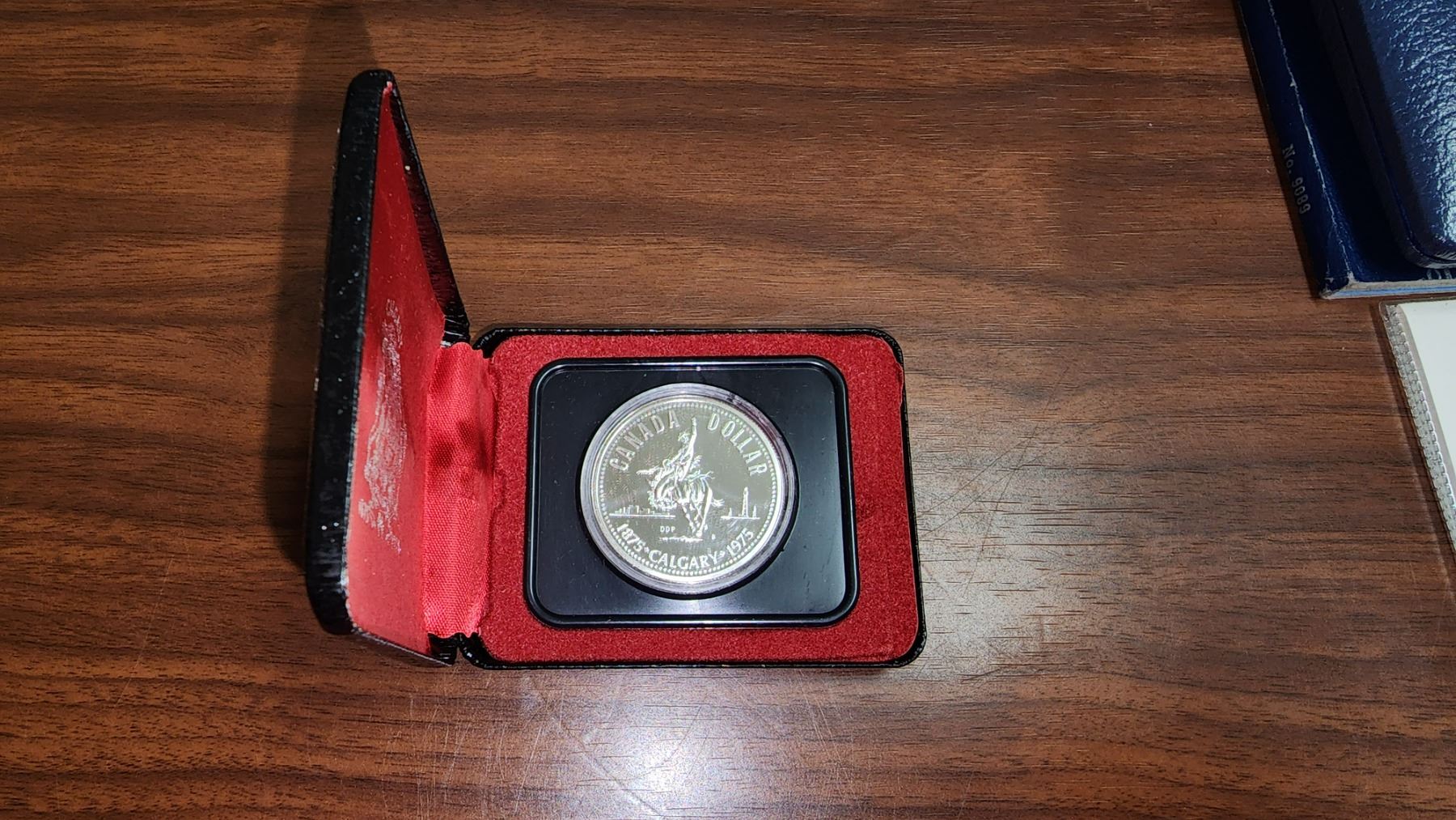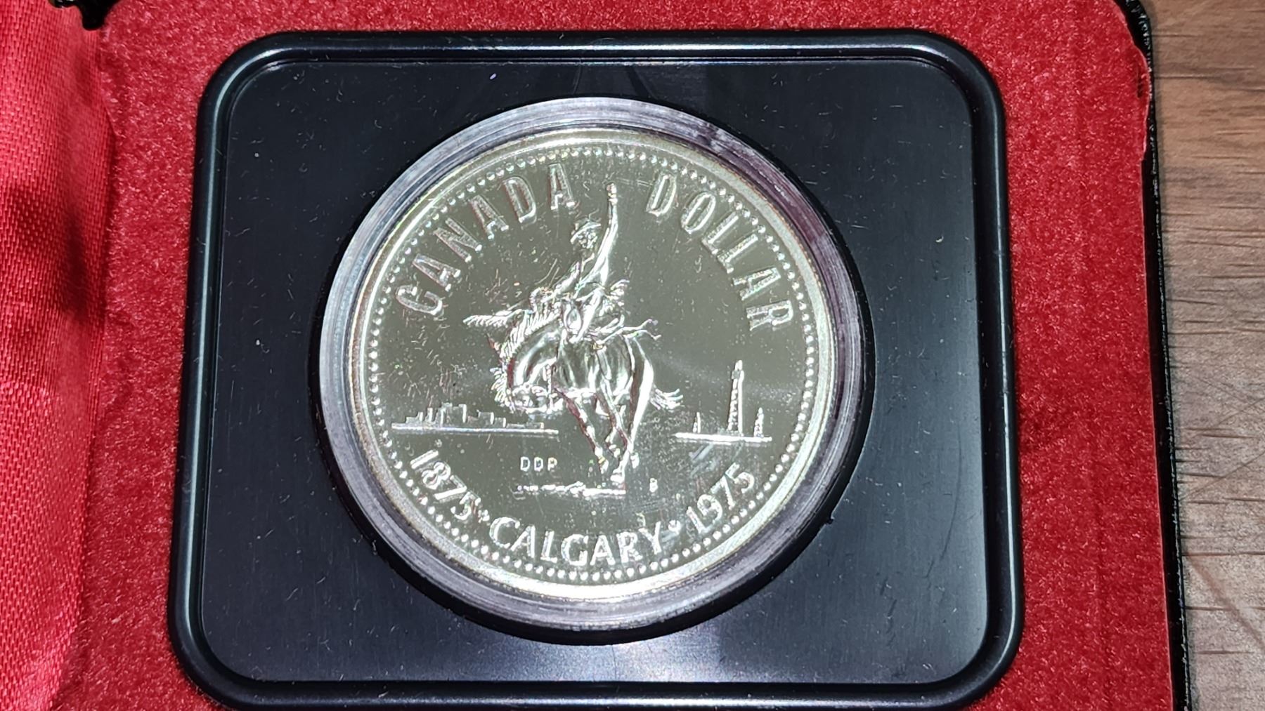1975 Specimen Calgary Centennial Silver Dollar. Housed in its original black case of issue.
