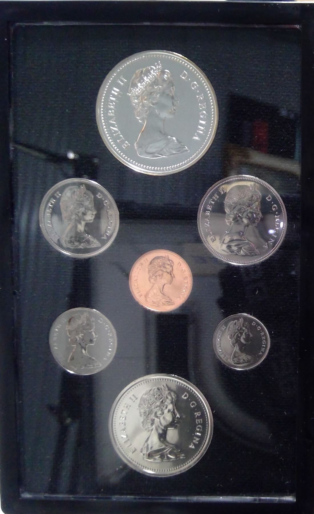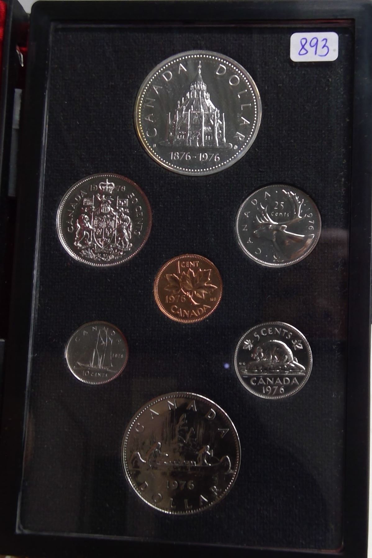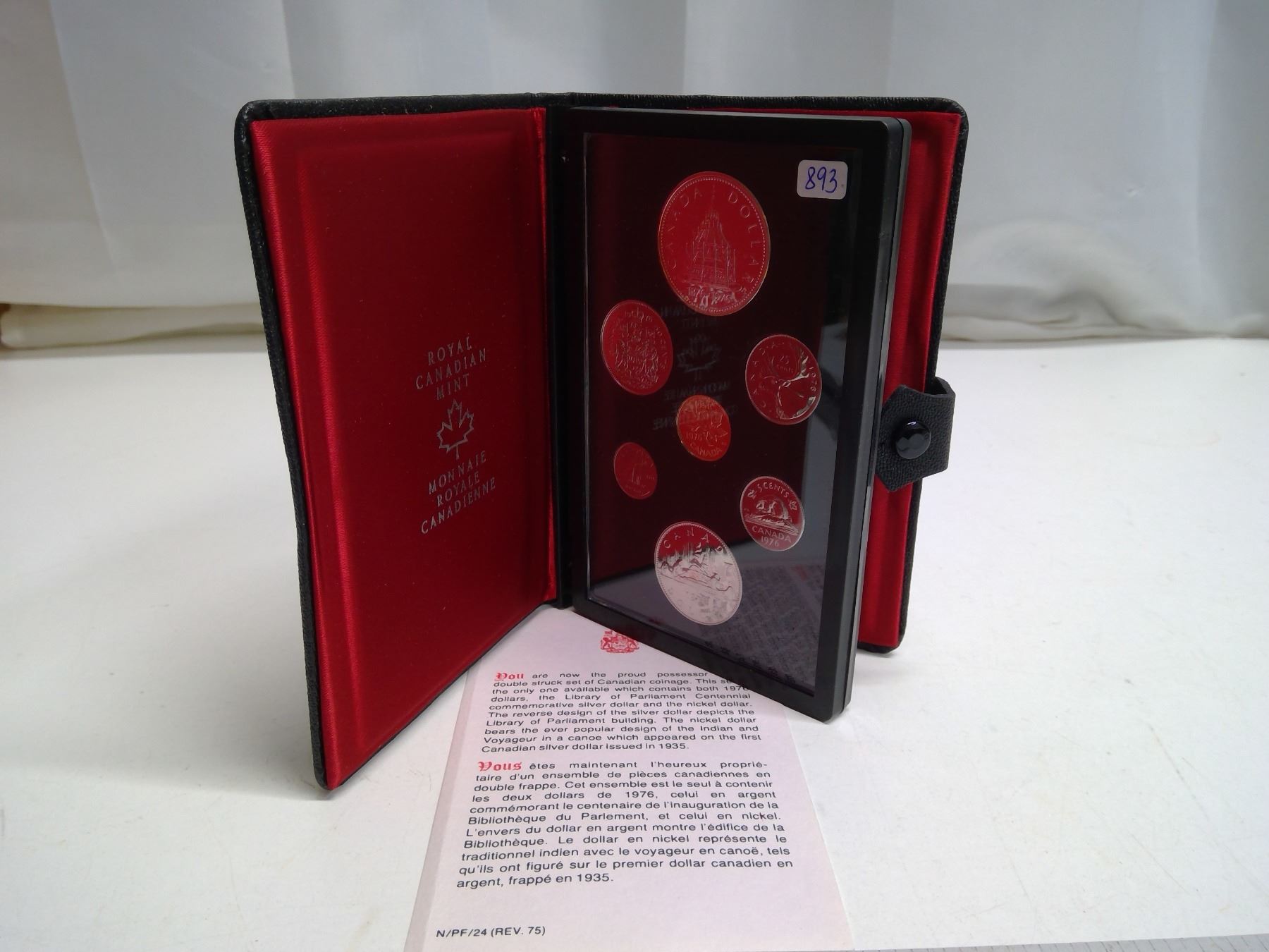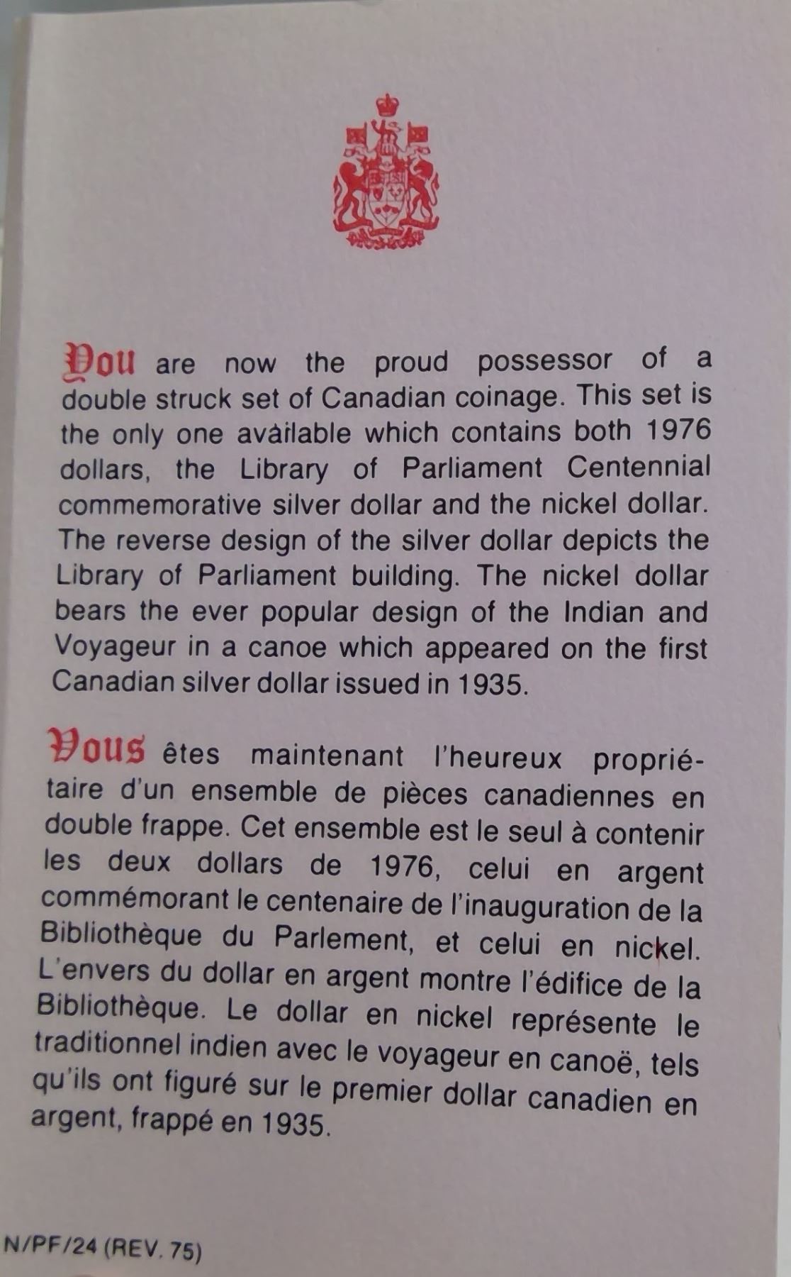 1976 Double Dollar Specimen Set. Two Dollars (one Silver, one Nickel). The Silver Dollar commemorates the Library of Parliament. Housed in its original Royal Canadian Mint case of issue.
