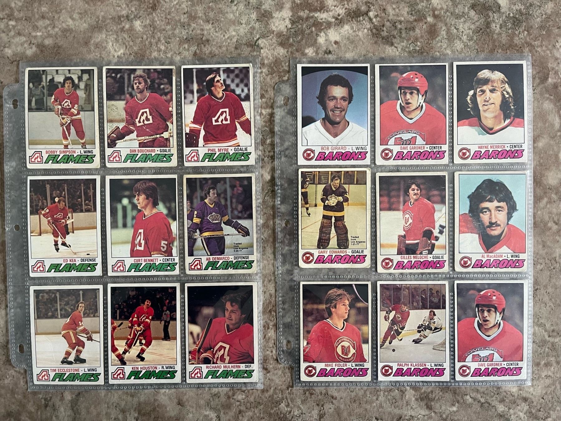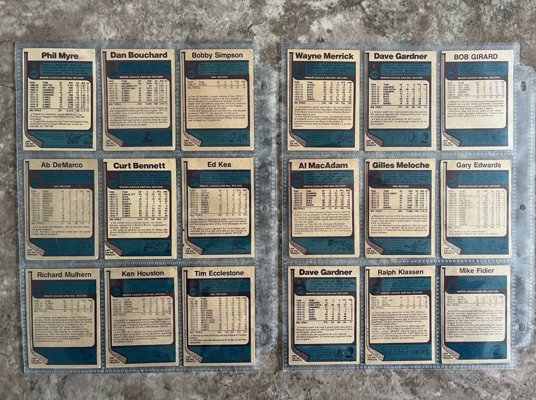 1977-78 lot of 18 O-Pee-Chee (OPC) hockey cards in page sleeves. Atlanta Flames & Cleveland Barons that no longer exist.