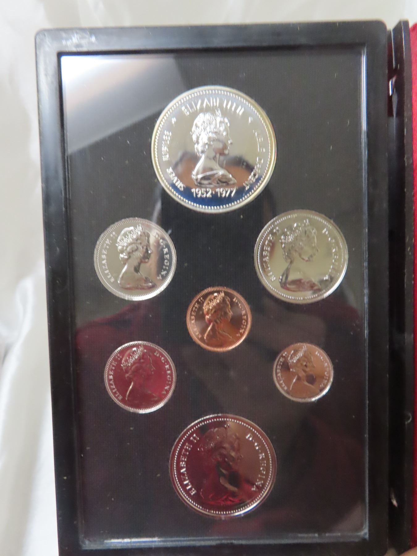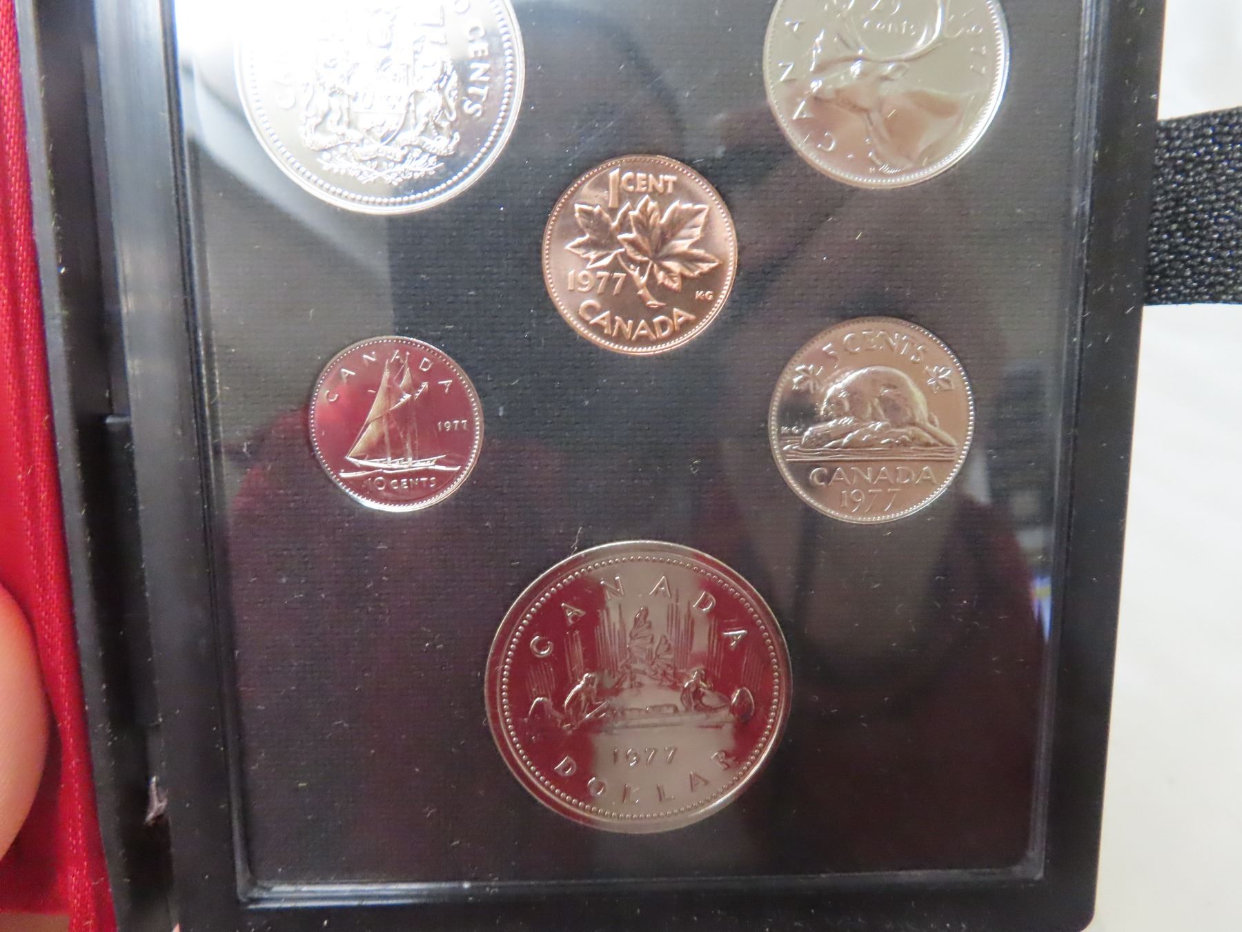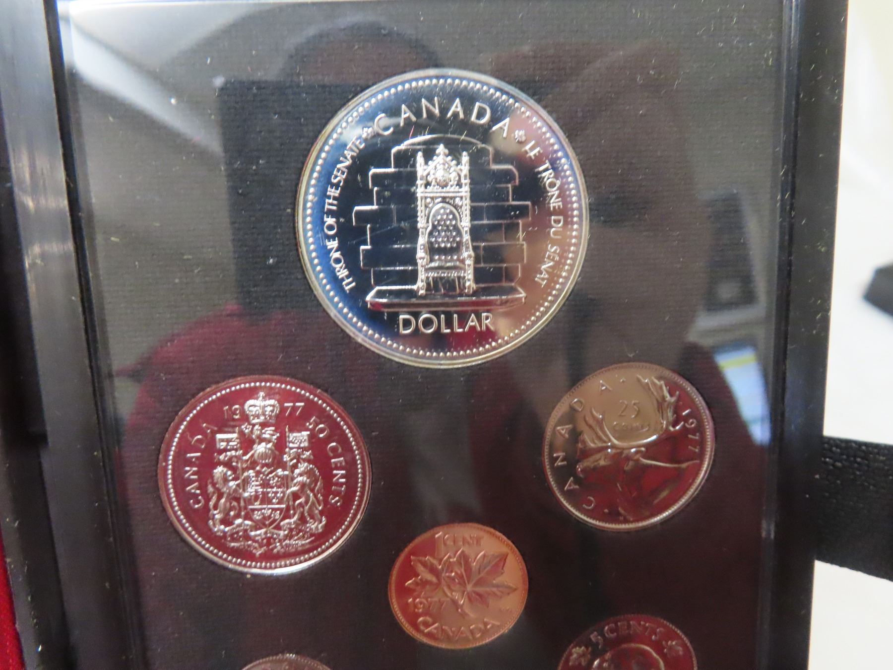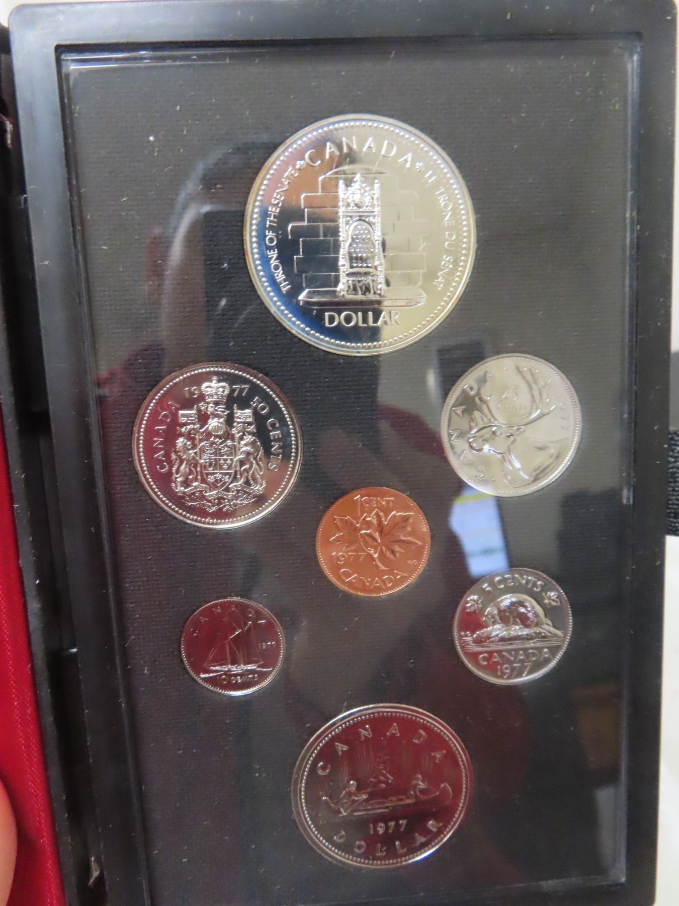 1977 Double Dollar Prestige Set. Silver Dollar marks the Silver Jubilee (25th Anniversary) of Queen Elizabeth. The Nickel Dollar has Short Water Lines in front of the canoe. 7-coin Specimen Set. Housed in its original Royal Canadian Mint case of issue. Includes Certificate of Authenticity.