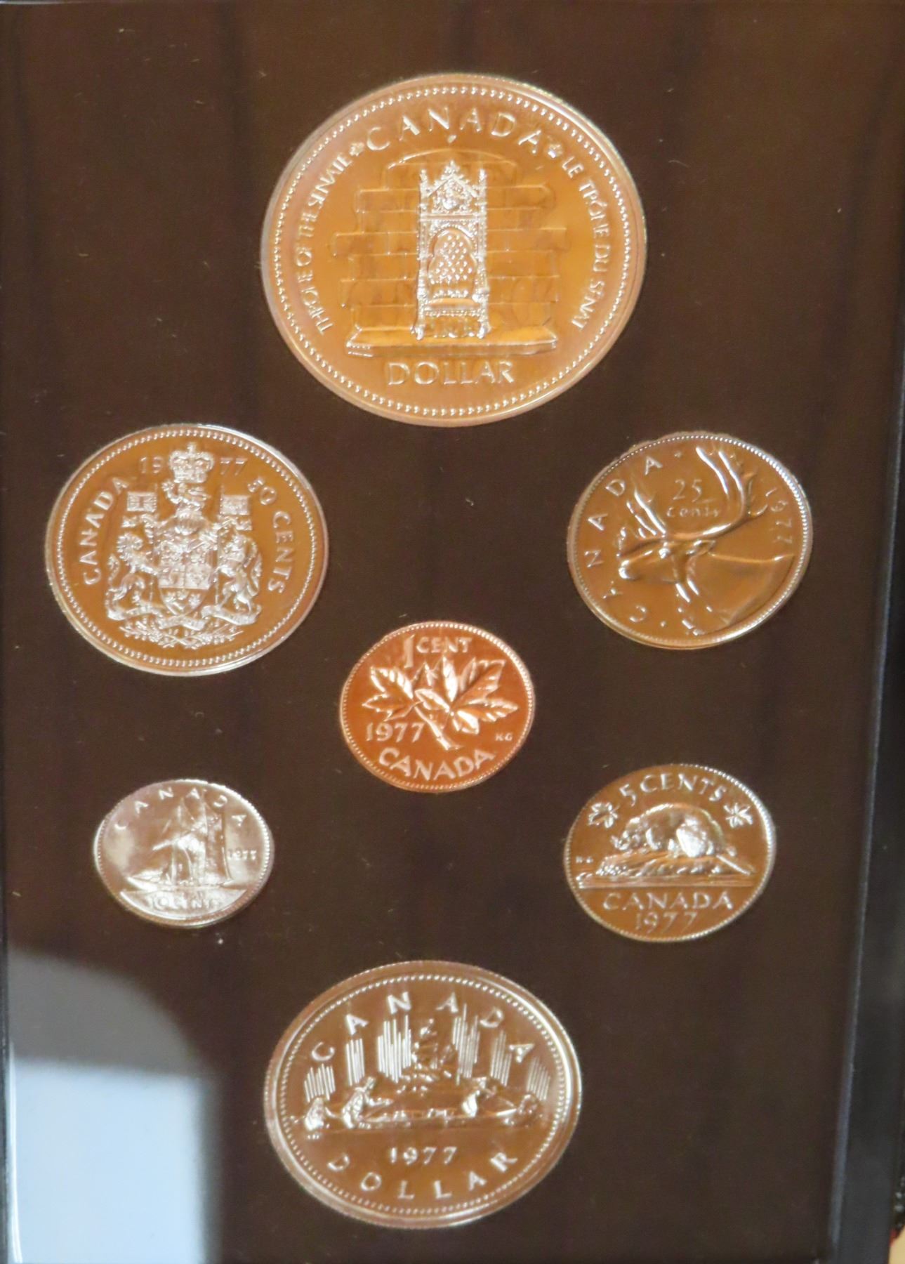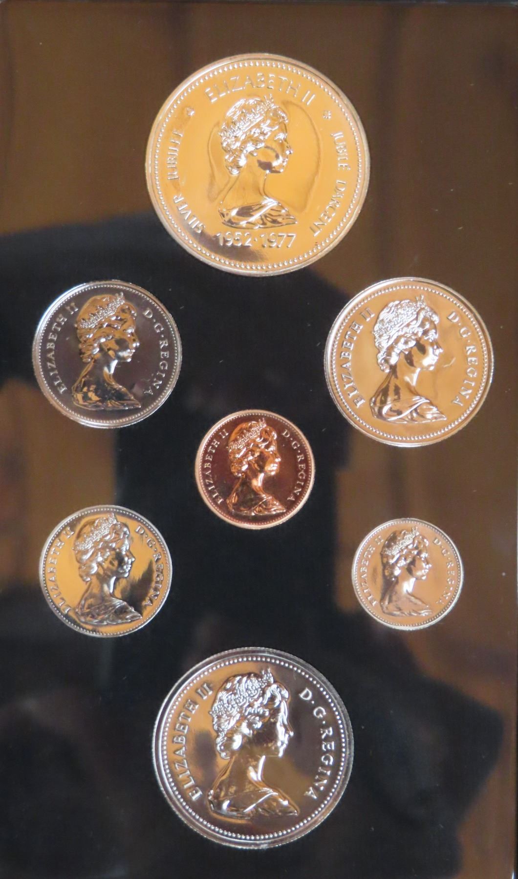 1977 Double Dollar Specimen Set. Silver Dollar commemorates the Silver Jubilee (25th Anniversary) of Queen Elizabeth. Housed in its original RCM case of issue. All coins Bright White.