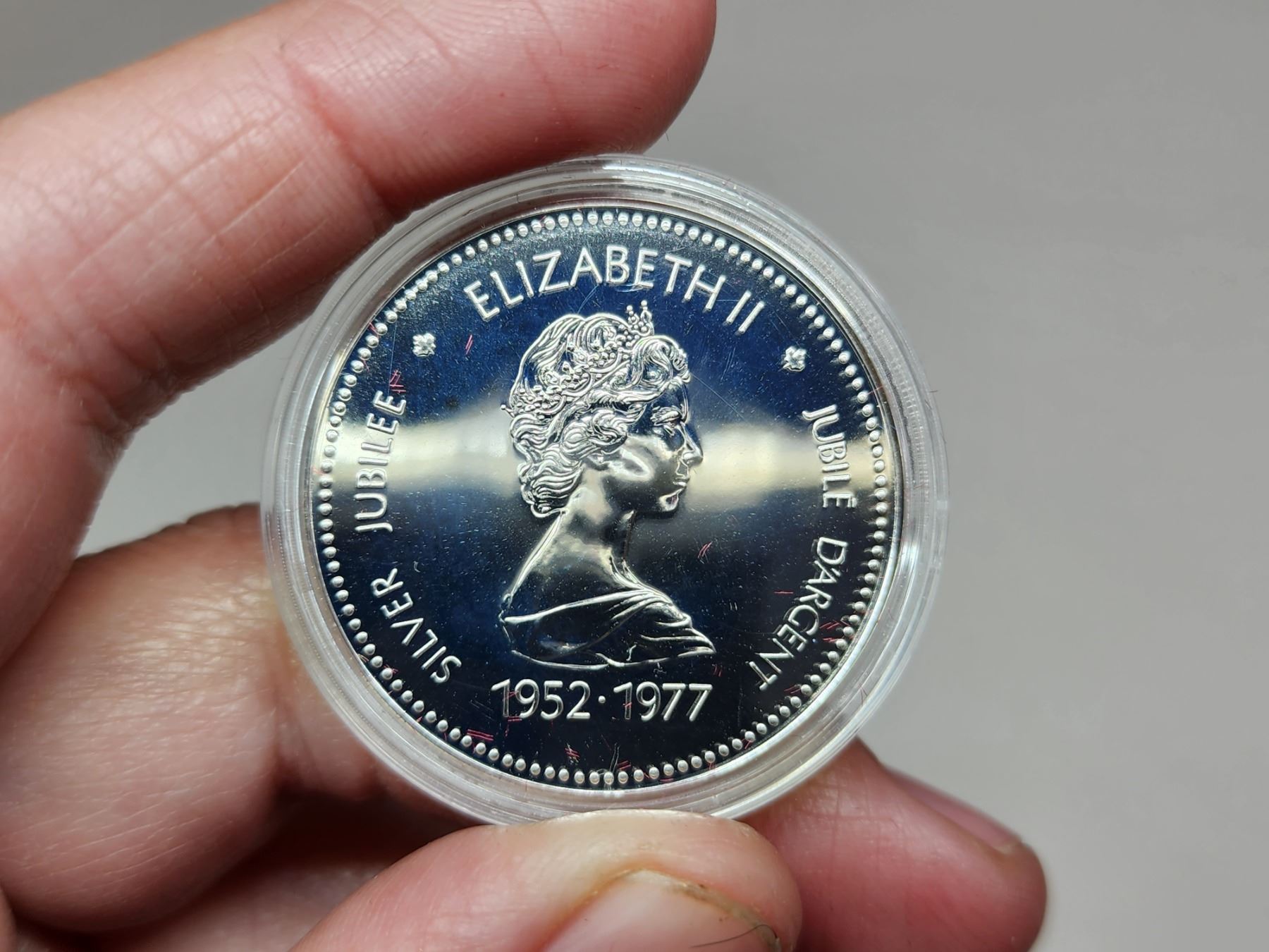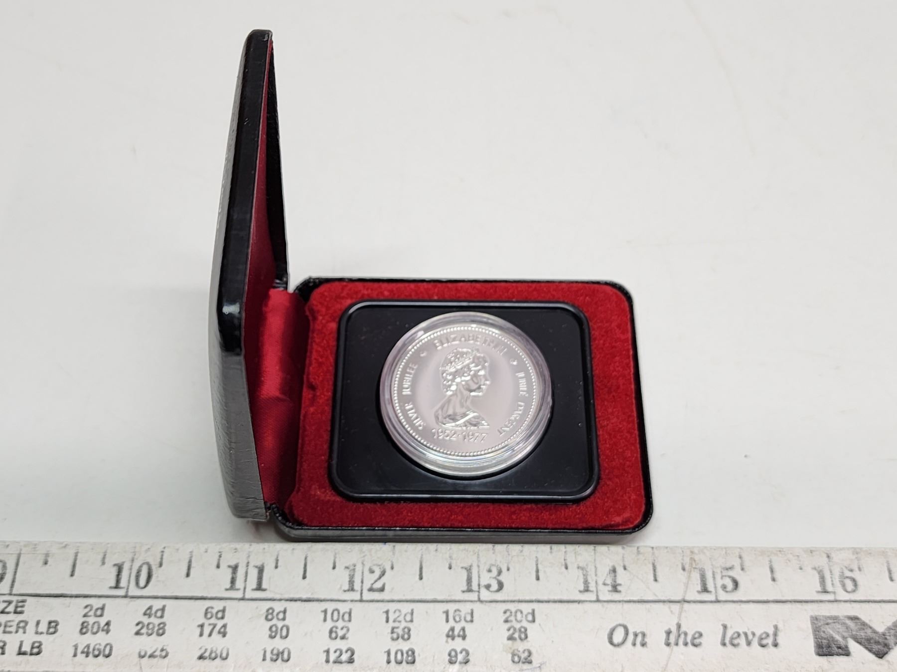 1977 Queen Elizabeth 25th Silver Anniversary Silver Dollar. Housed in its original black clamshell case of issue. Specimen. Bright White.