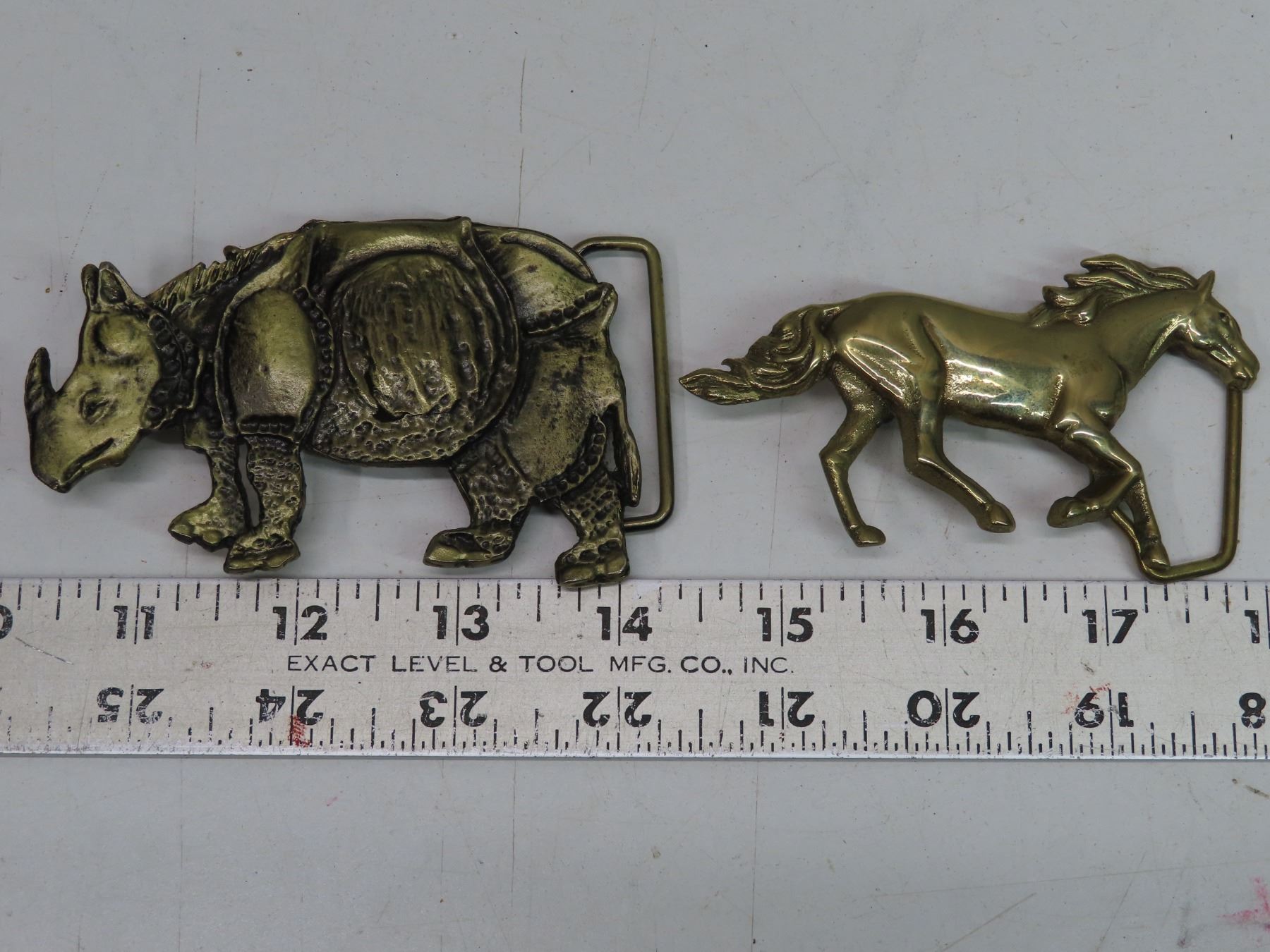 1978 Baron Buckle (shaped like a horse) & a Rhinoceros buckle – both solid brass