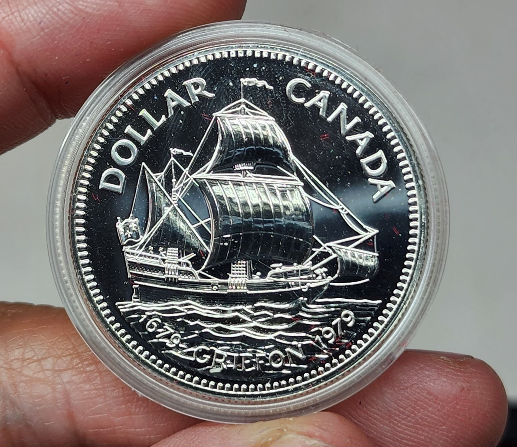 1979 Griffon Silver Dollar. 300th Anniversary of the first voyage by a commercial ship on the Great Lakes. Specimen. Bright White. Housed in its original RCM case of issue.