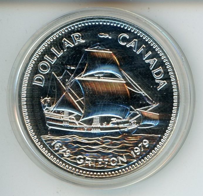 1979 Griffon Specimen Silver Dollar. 300th Anniversary of the first voyage by a commercial ship on the Great Lakes. Housed in its original hard plastic holder.