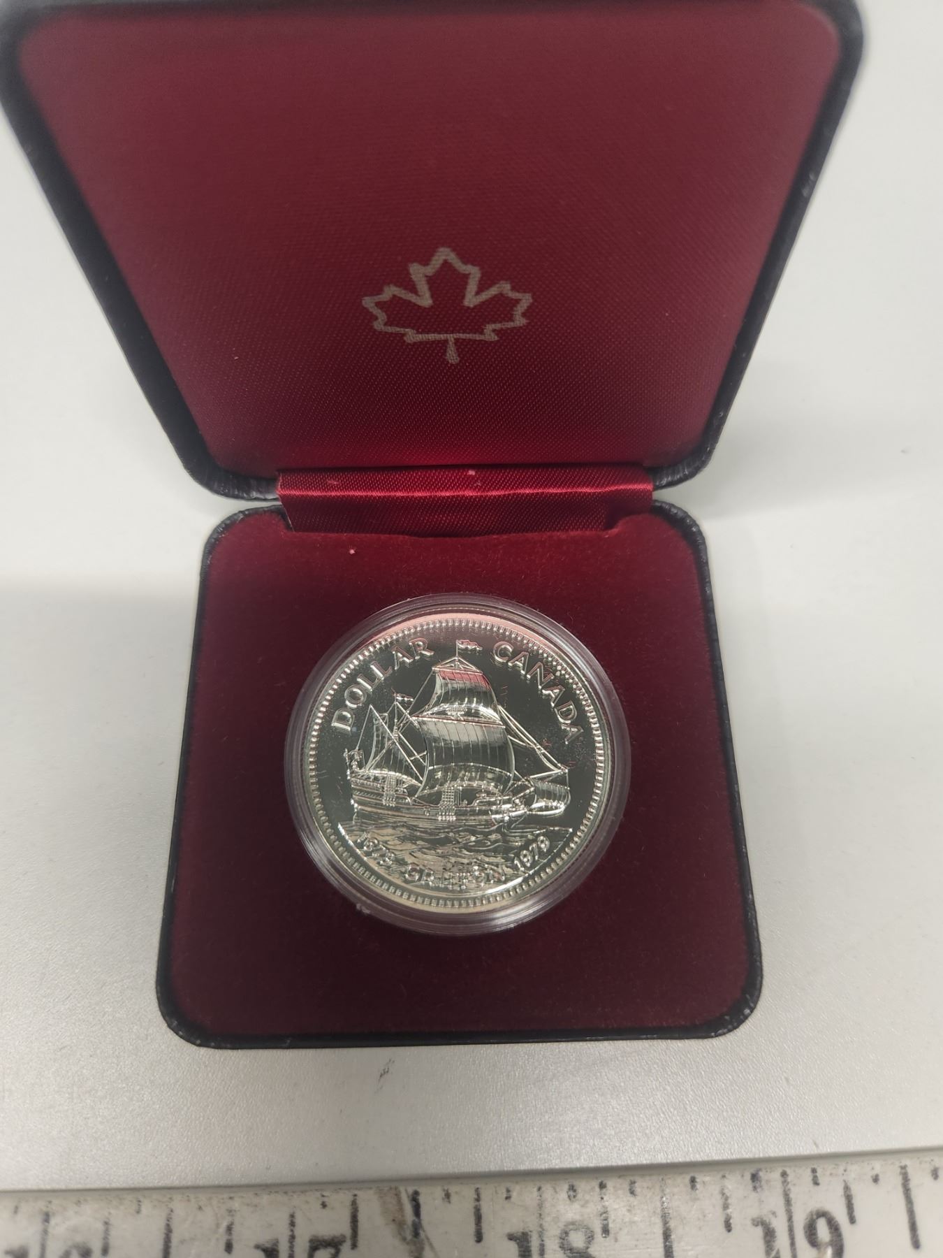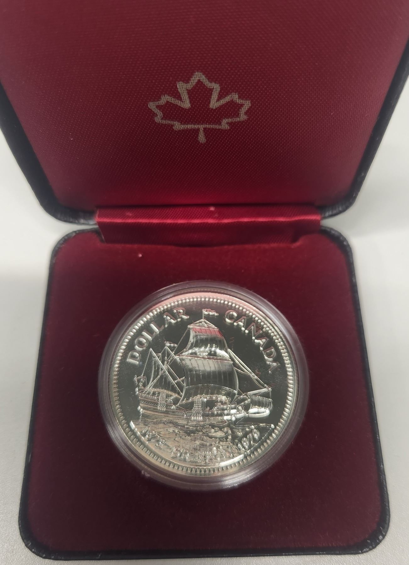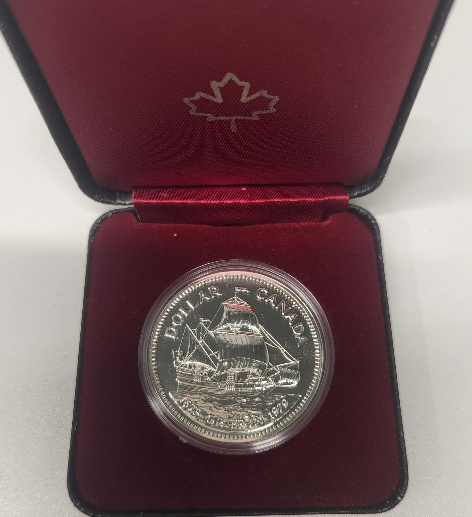 1979 Griffon Specimen Silver Dollar. Commemorates the 300th Anniversary of the first voyage of the Griffon, the first commercial ship on the Great Lakes. Bright White. In black case of issue.