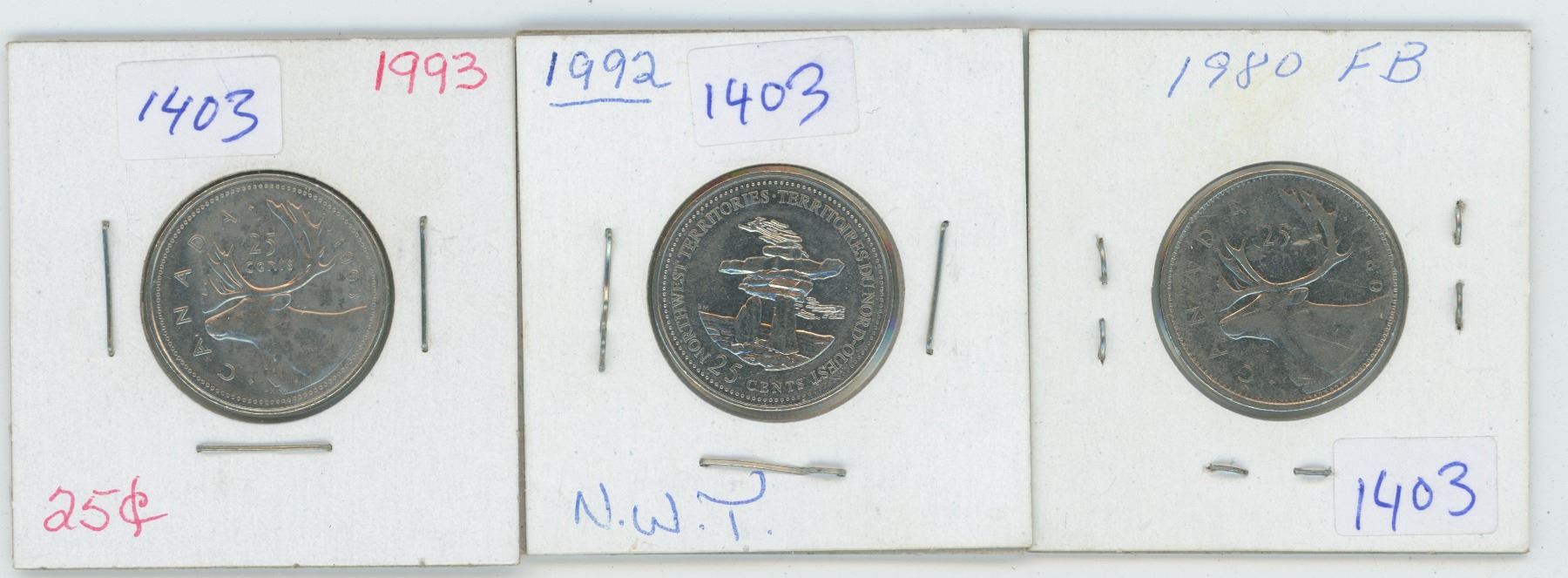 1980 & 1992 & 1993 Canadian 25 Cent Coins