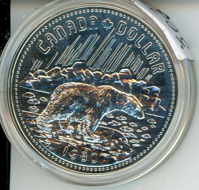 1980 Arctic Silver Dollar. 100th Anniversary of Britain transferring the Arctic Islands to Canada. Popular polar bear. Specimen-66. Bright White.