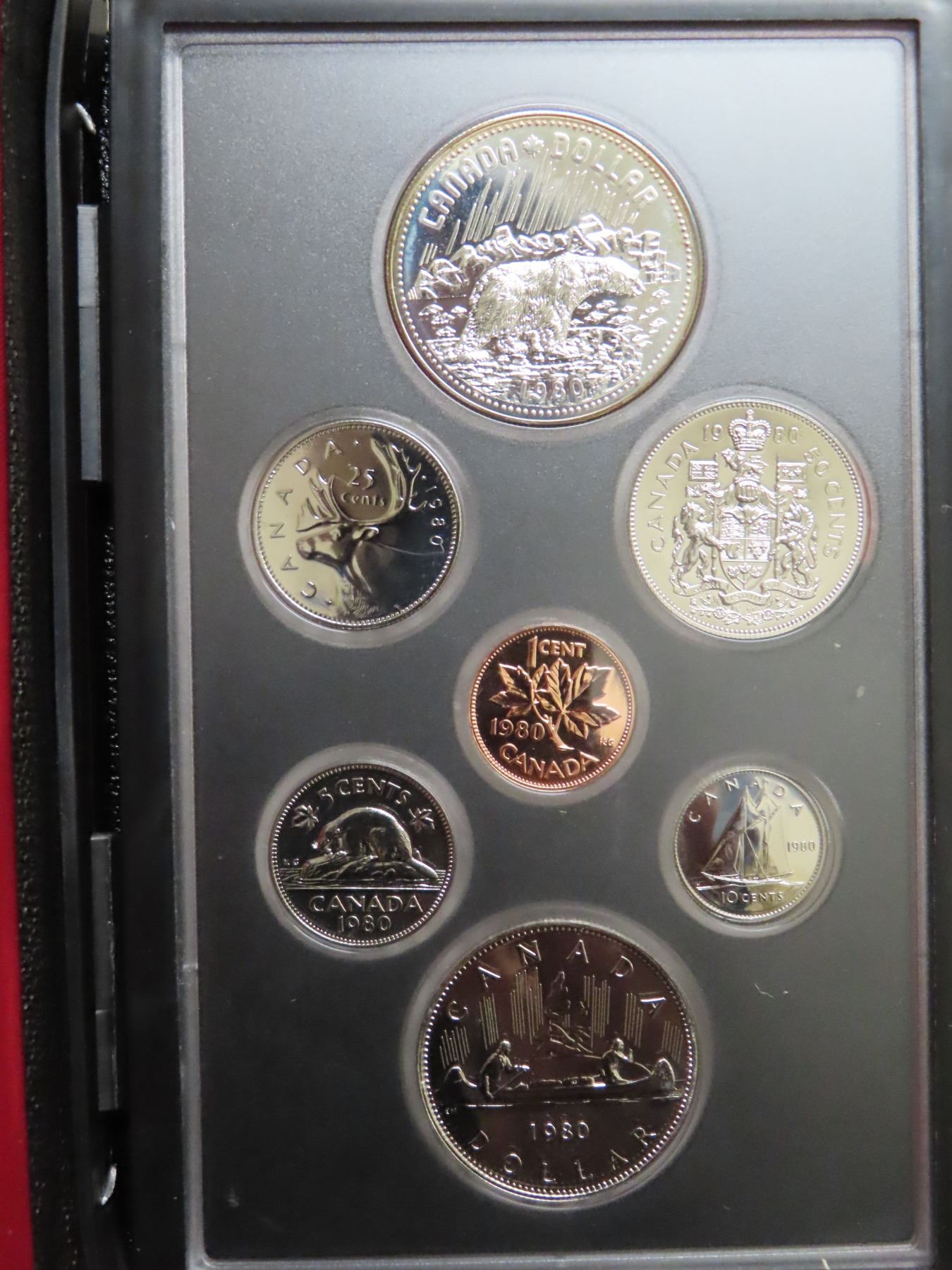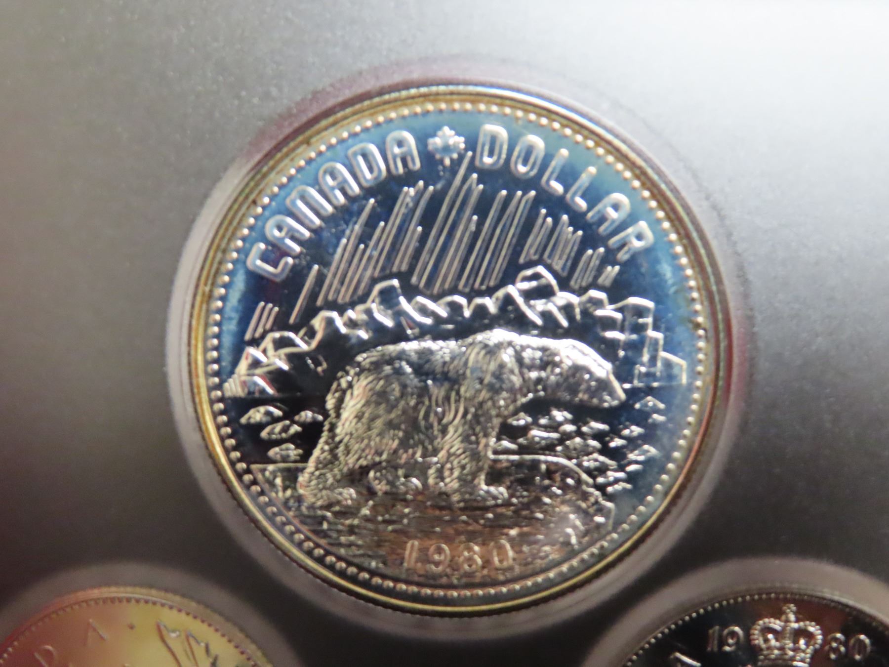 1980 Double Dollar Specimen Set. The Silver Dollar commemorates the 100th Anniversary of the British government ceding the Arctic Islands to Canada. Popular polar bear. Housed in its original RCM case. Includes Certificate of Authenticity.