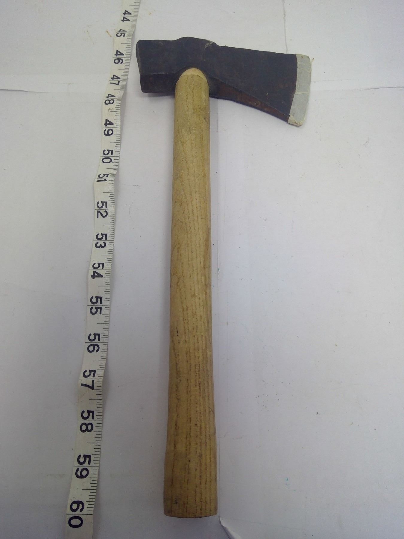 Hand forged in South Korea for an American soldier throwing axe. Length: 13”. Head is 5 ½” long. Blade: 3”. 1980.
