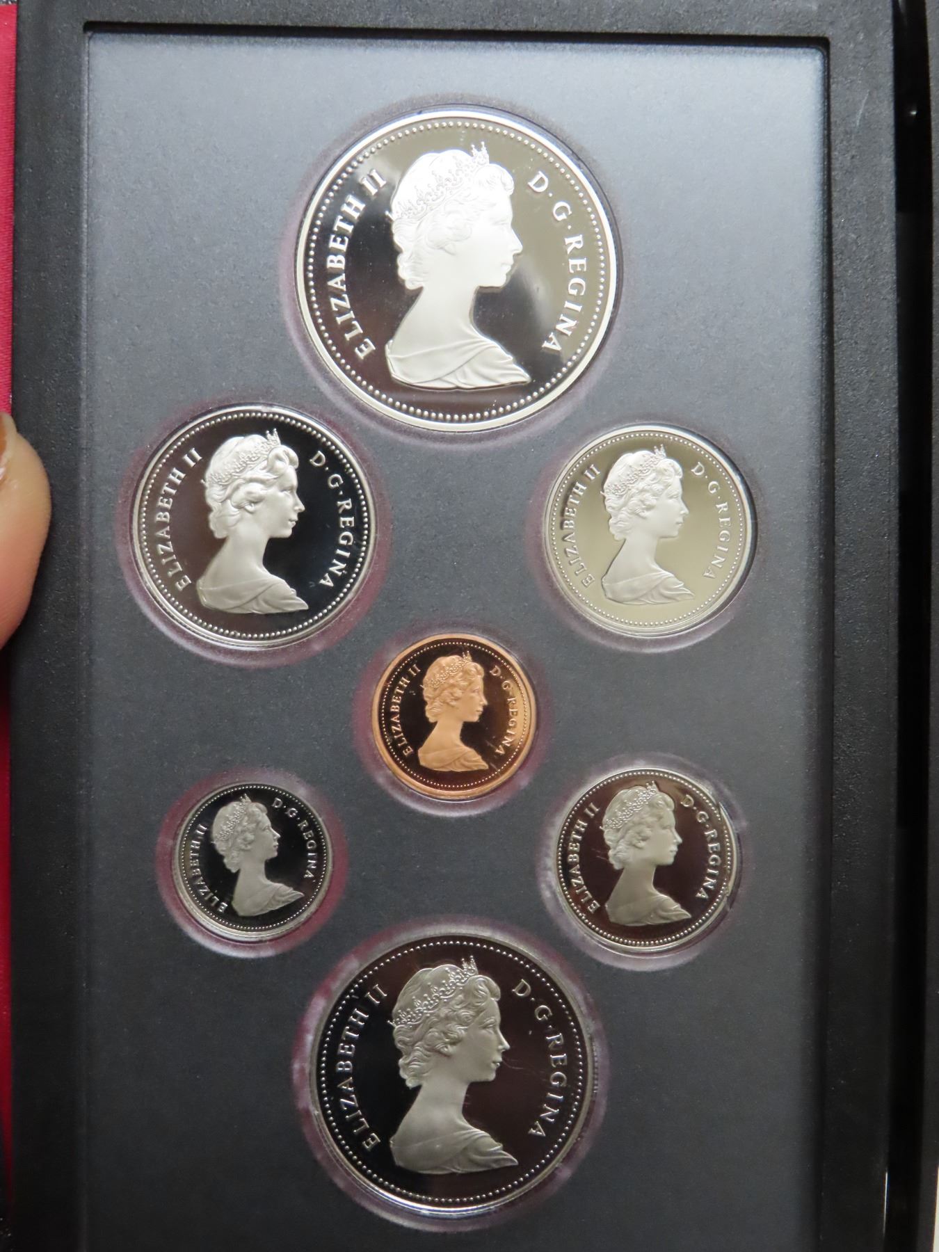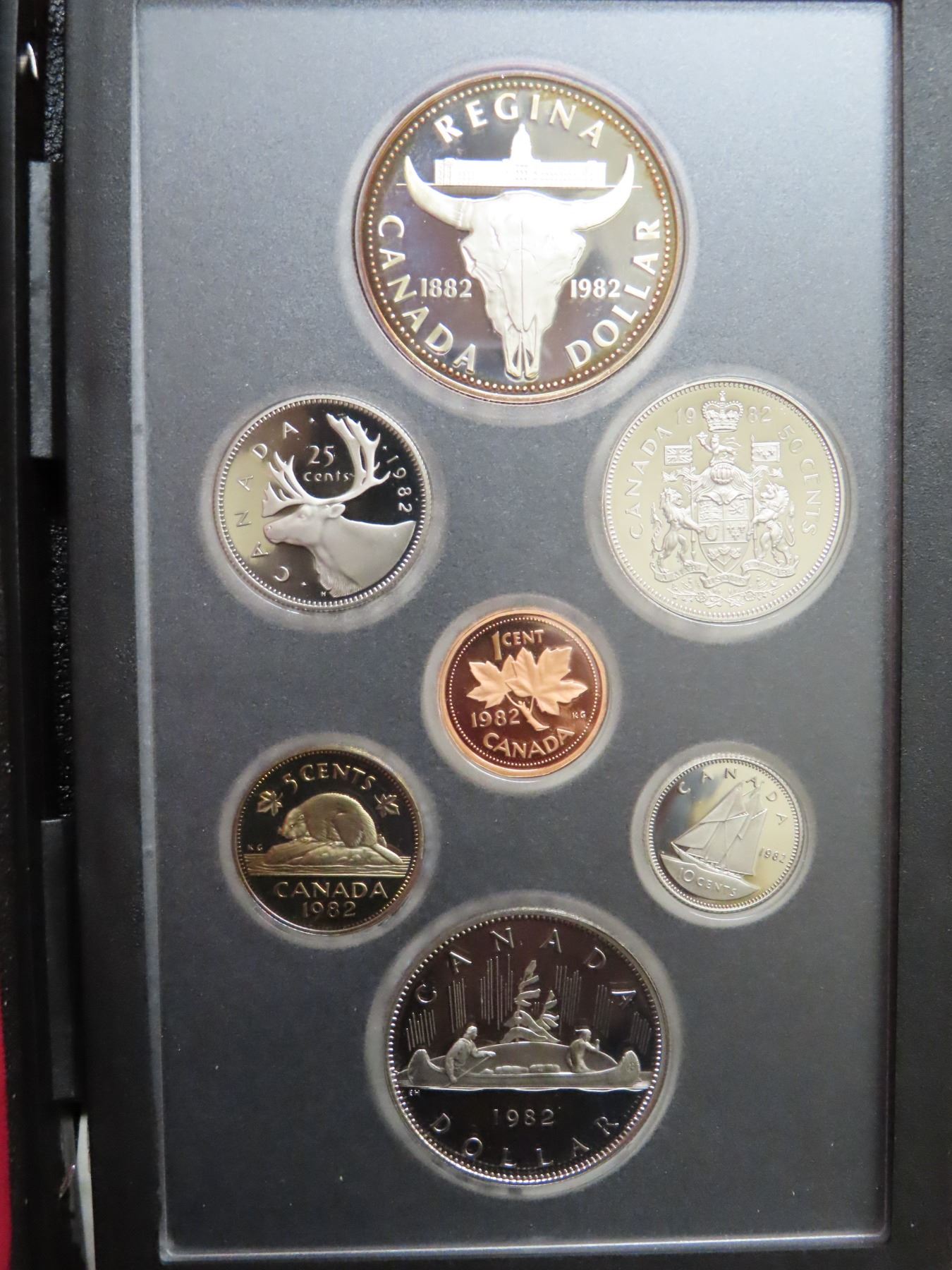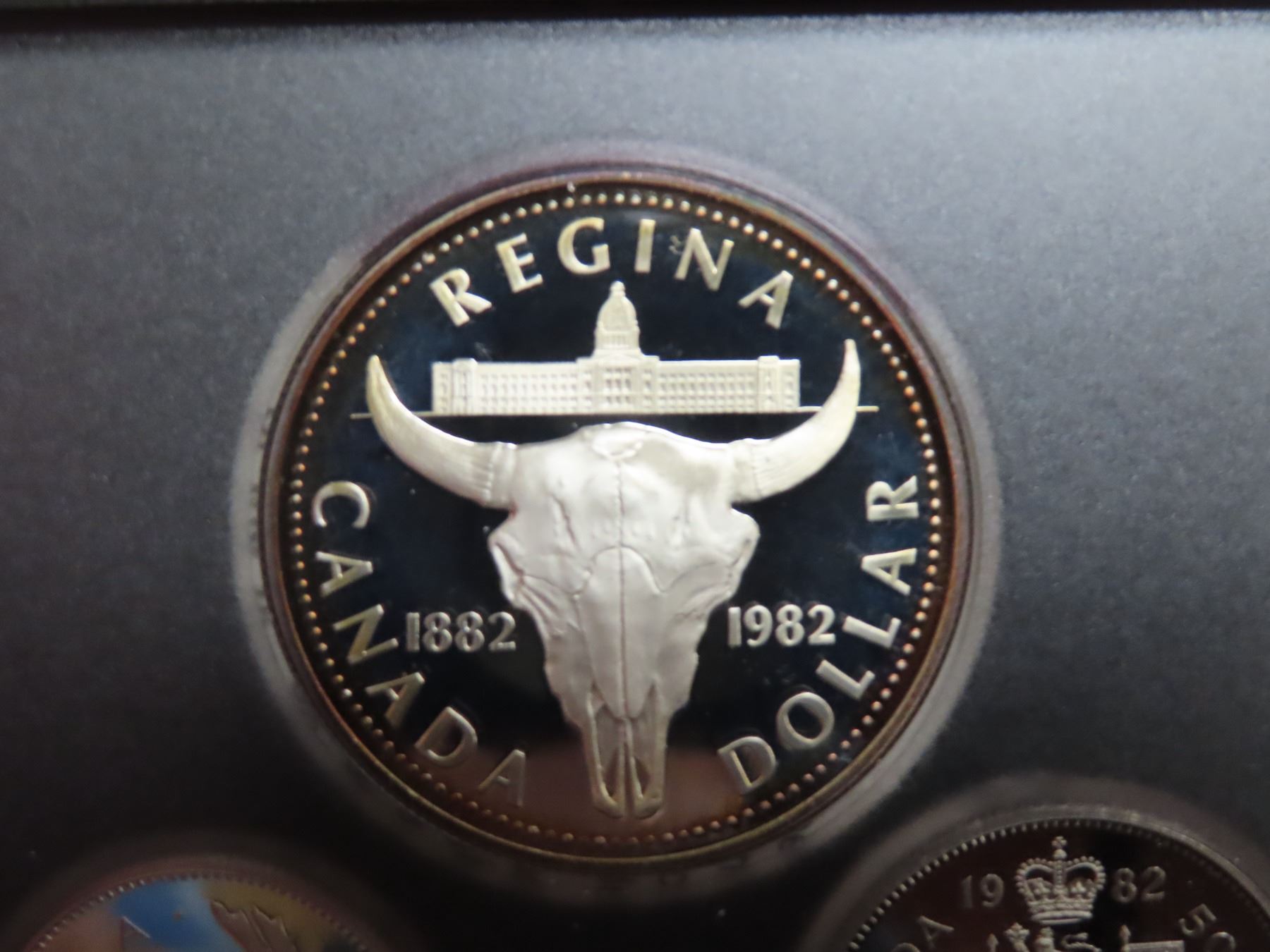 1982 Double Dollar Proof Set. The beautifully toned Silver Dollar commemorates the 100th Anniversary of Regina. Popular bison skull. Proof with Ultra Heavy Cameos. Housed in its original RCM case. Includes Certificate of Authenticity.