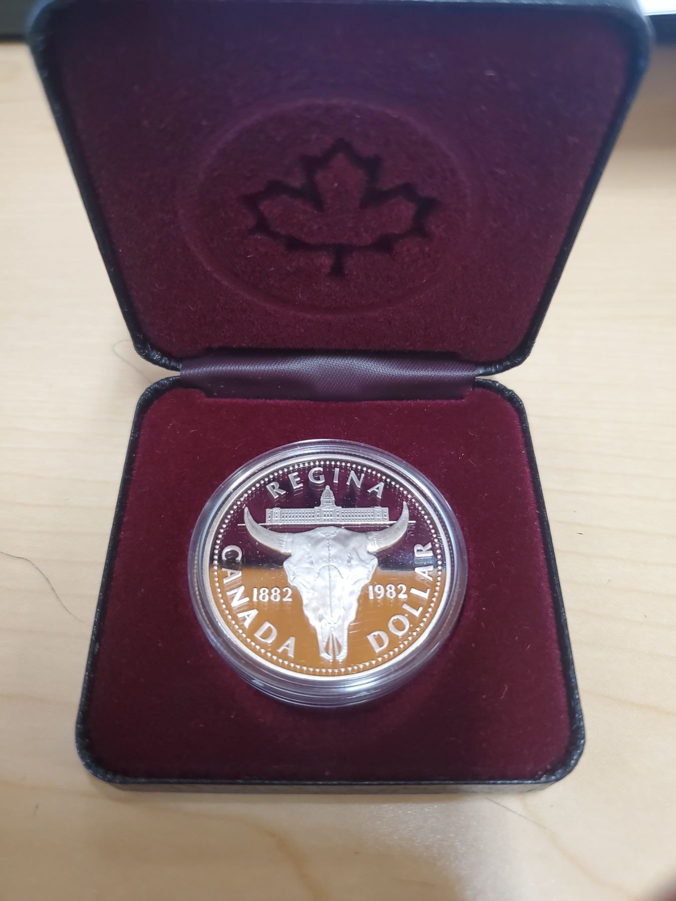1982 Regina Centennial Silver Dollar. Bison skull. Proof. Bright White. Housed in its original black case.