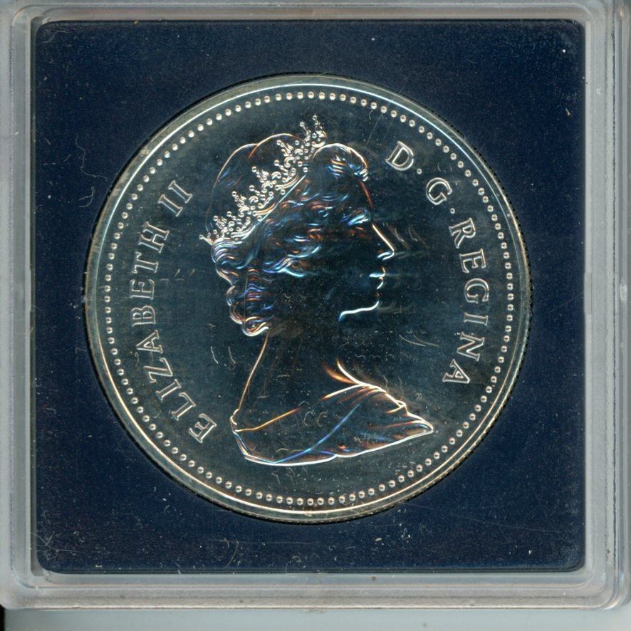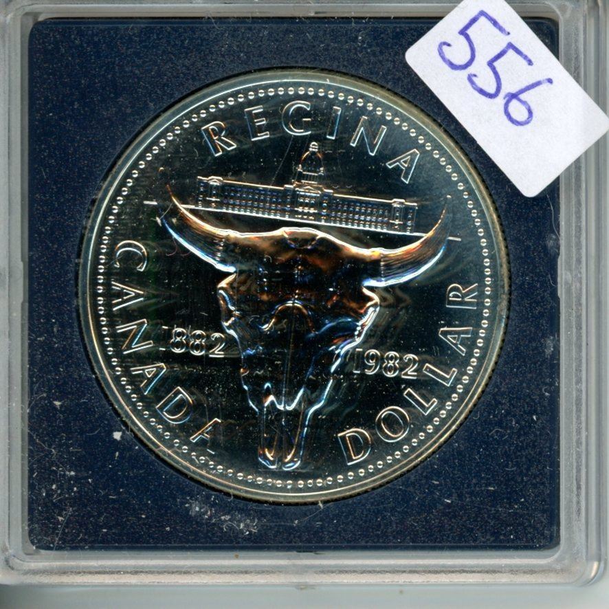 1982 Regina Centennial Silver Dollar. Bison skull. Specimen. Housed in its original hard plastic holder.