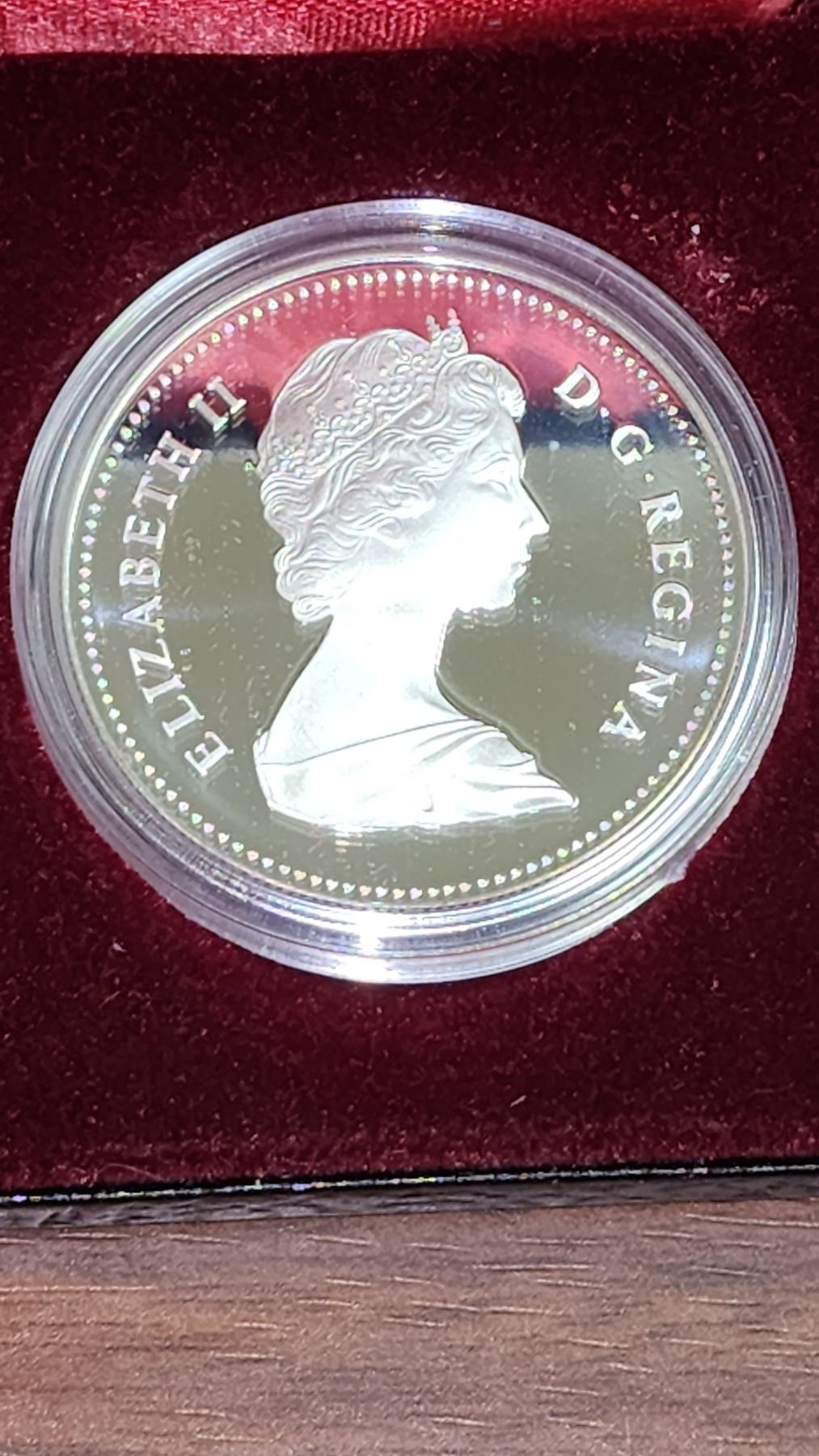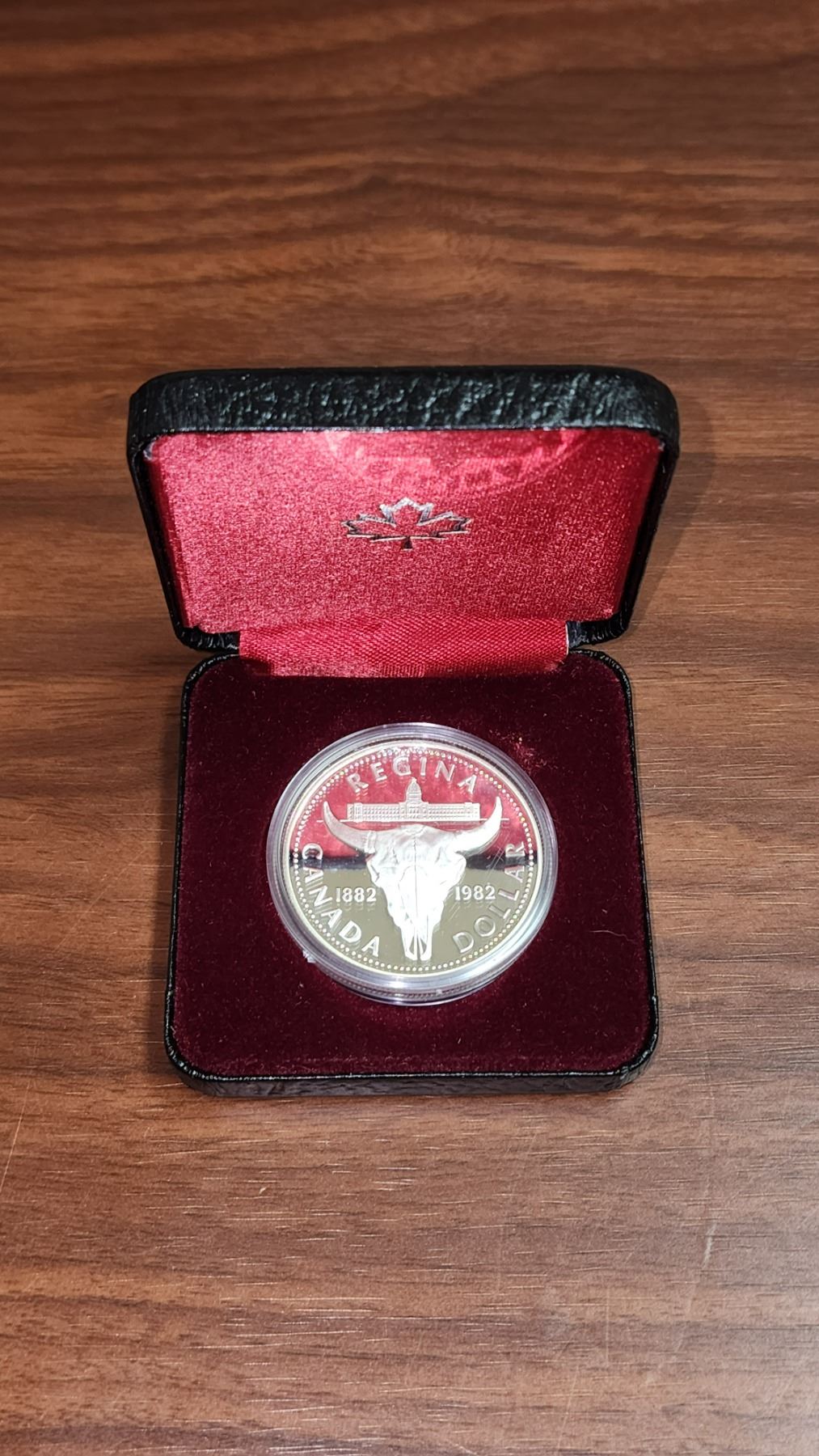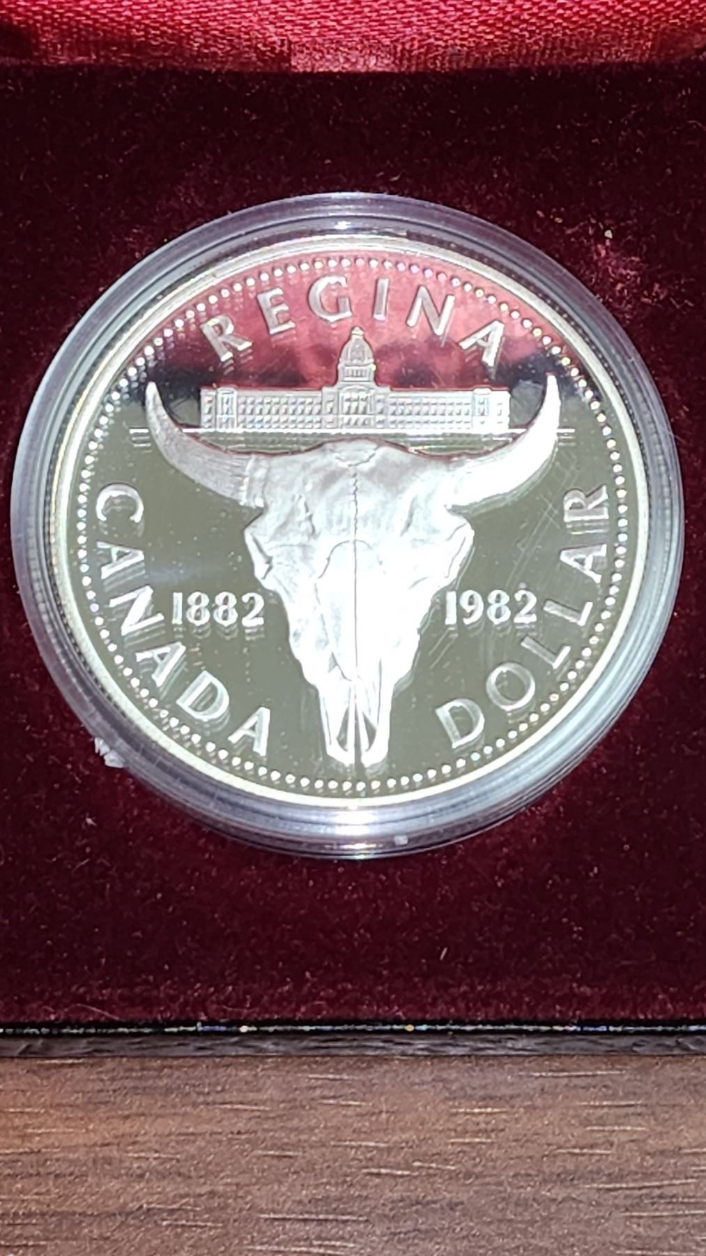 1982 Regina Centennial Silver Dollar. Commemorates the 100th Anniversary of the founding of Regina. Popular bison skull. Proof with Ultra Heavy Cameo. Bright White. Housed in its original case of issue.