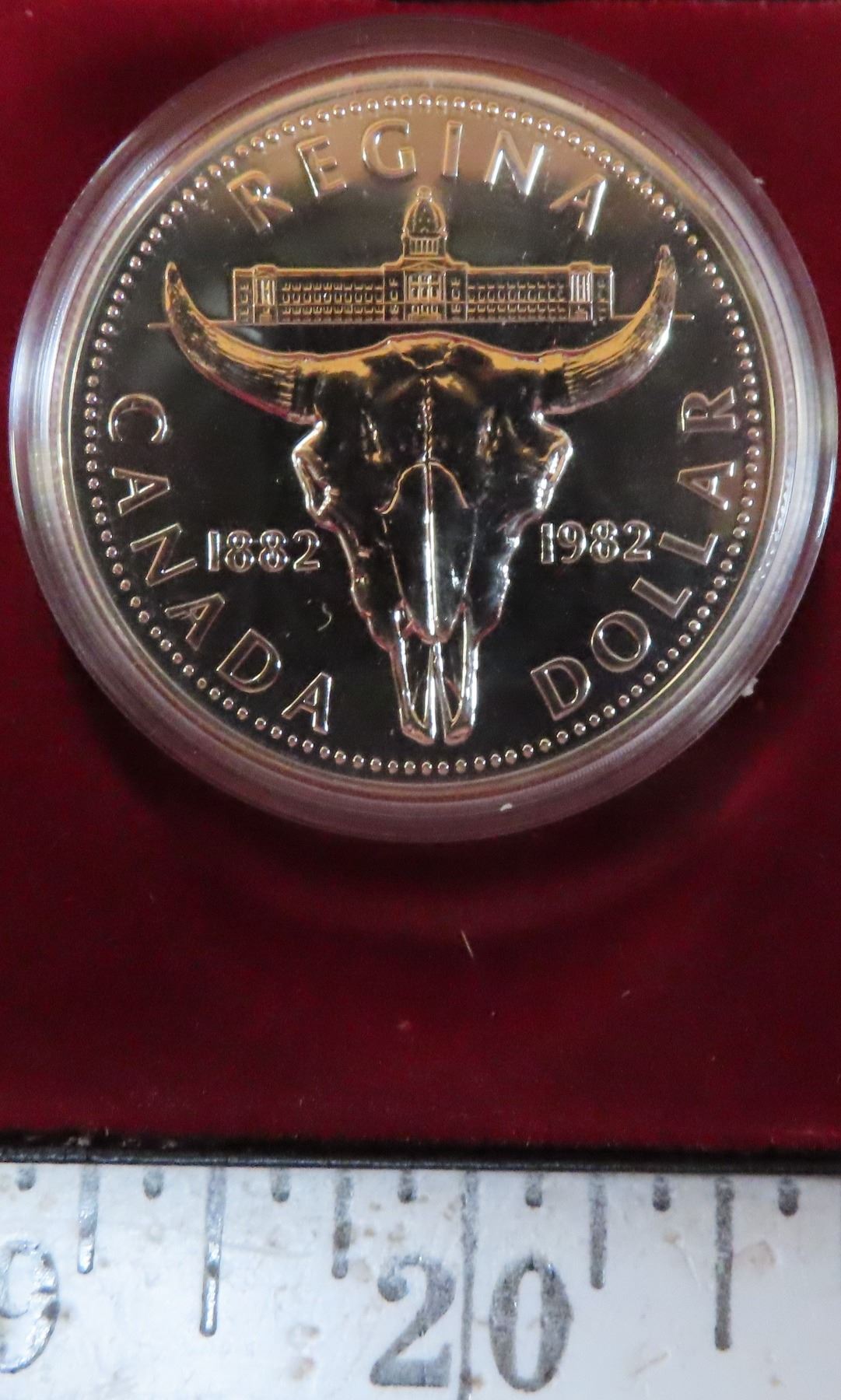 1982 Regina Centennial Specimen Silver Dollar. Popular Bison Skull. Bright White. Housed in a black case.