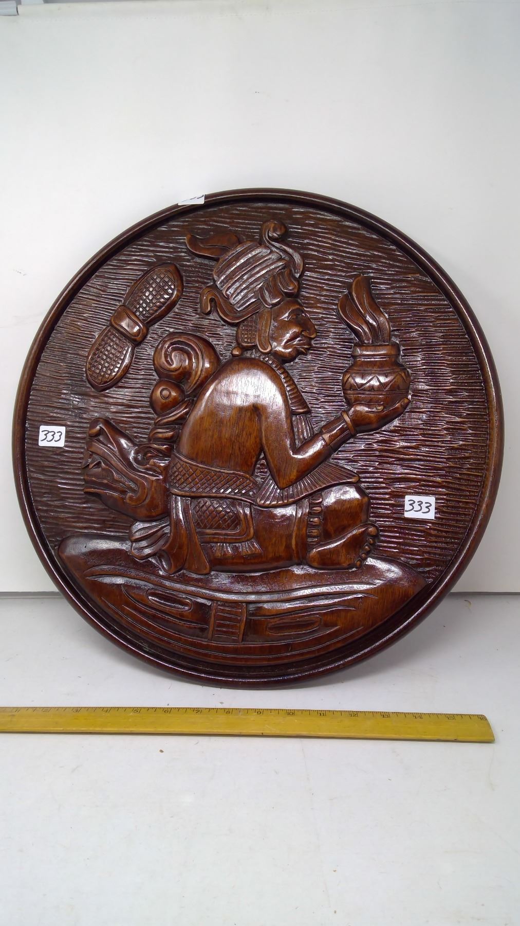 1983 Honduras Mahogany Plank 1" Thick Carving - 18" Diameter - 'Mayan Offering'