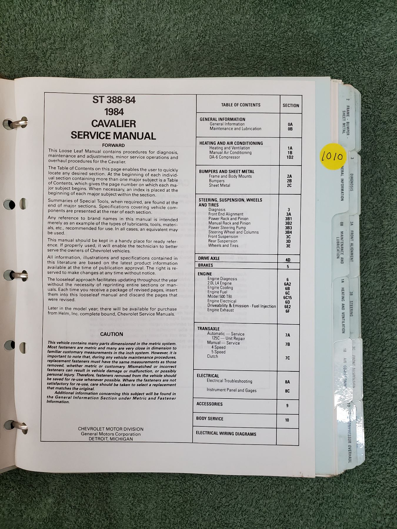 1984 Chevrolet Cavalier Loose Leaf Service Manual