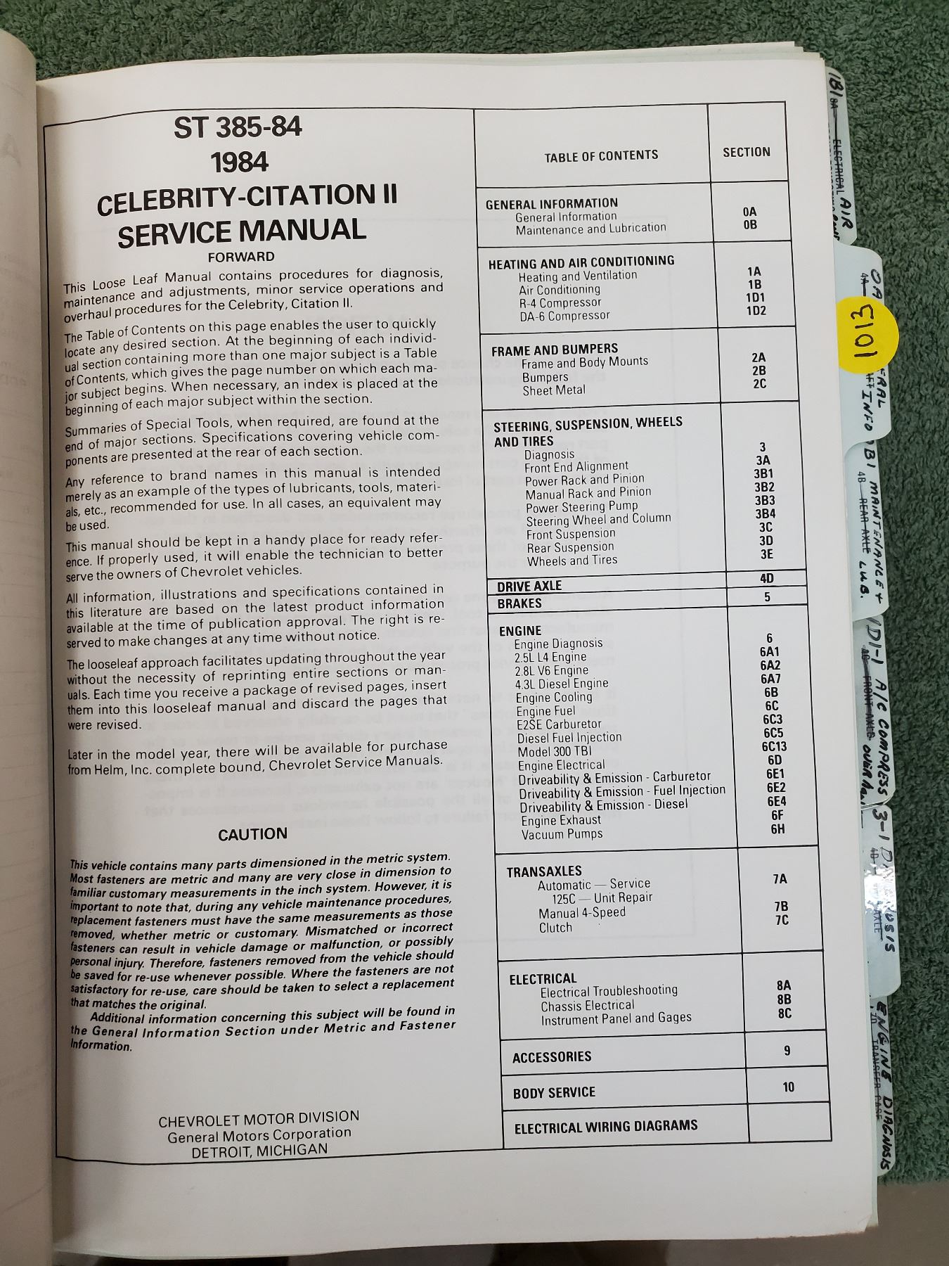 1984 Chevrolet Celebrity Citation II Loose Leaf Service Manual