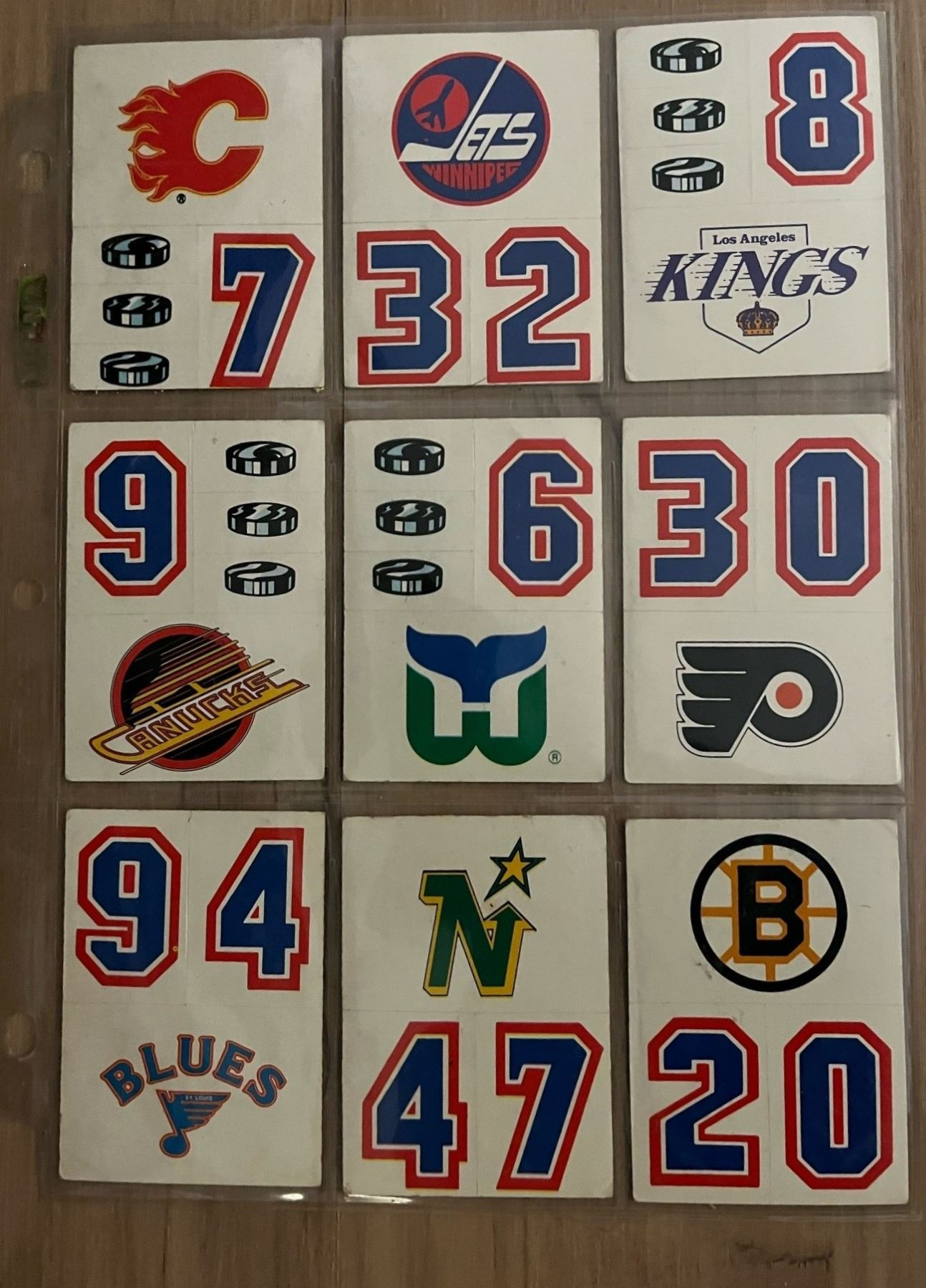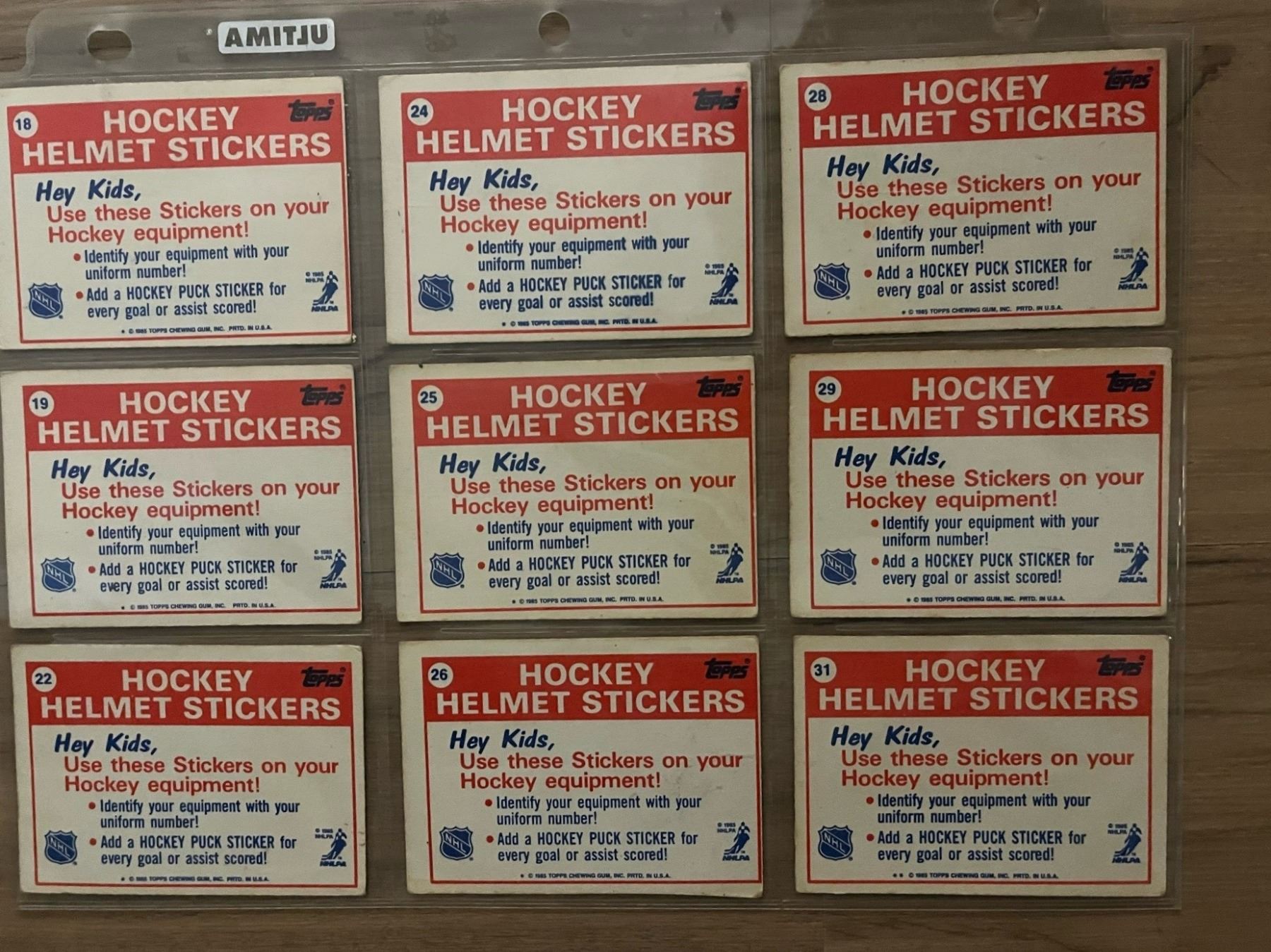 1985 Topps Hockey Helmet Stickers. Lot of 9 different cards.